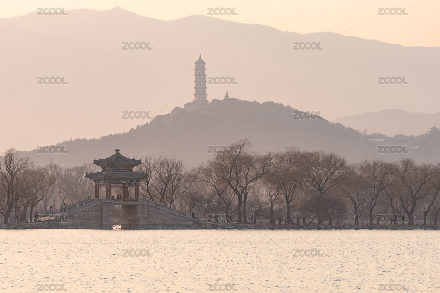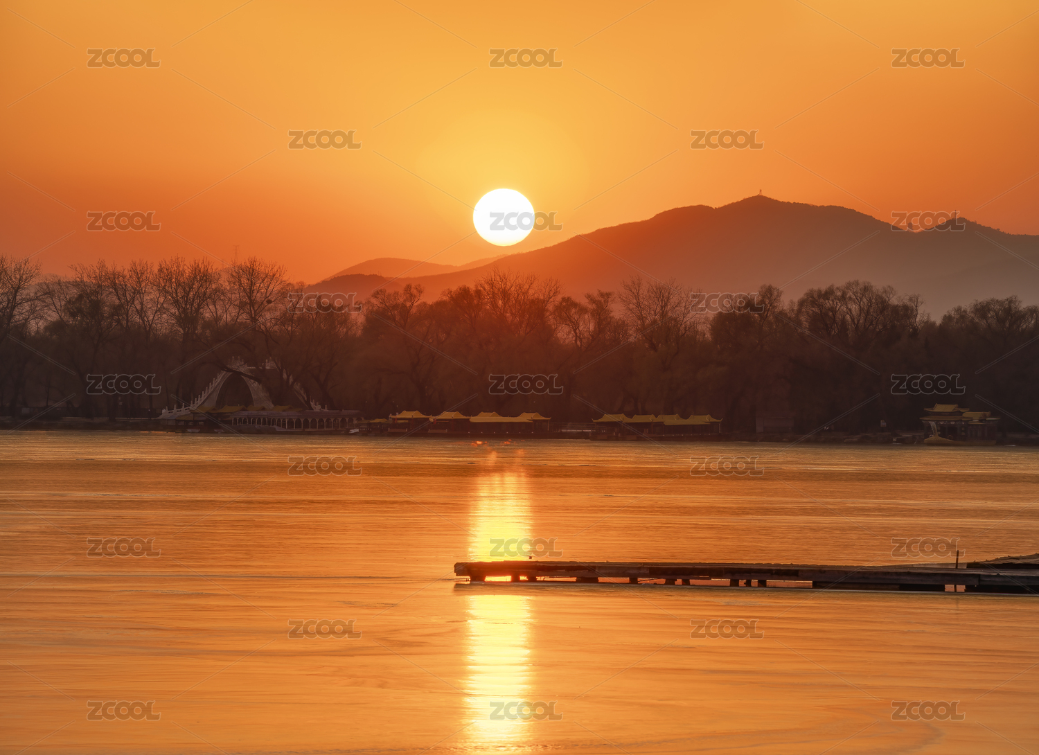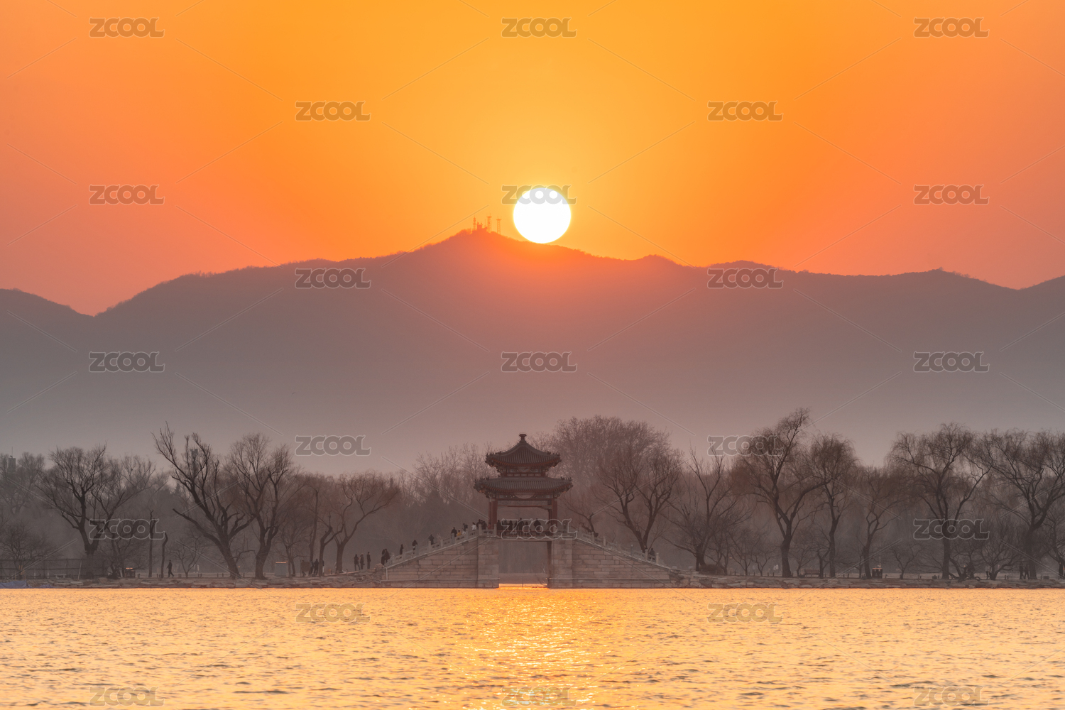 北京市颐和园昆明湖玉峰塔冬季落日风光