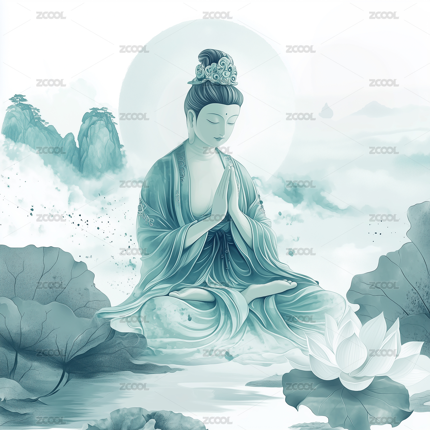 观世音菩萨坐在莲花-国潮风插画