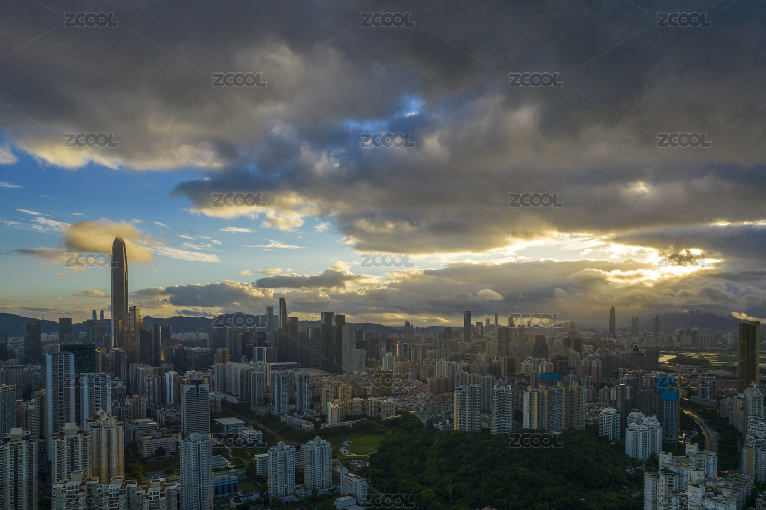 夏日黄昏鸟瞰中国广东省深圳城市天际线建筑群高楼大厦风光