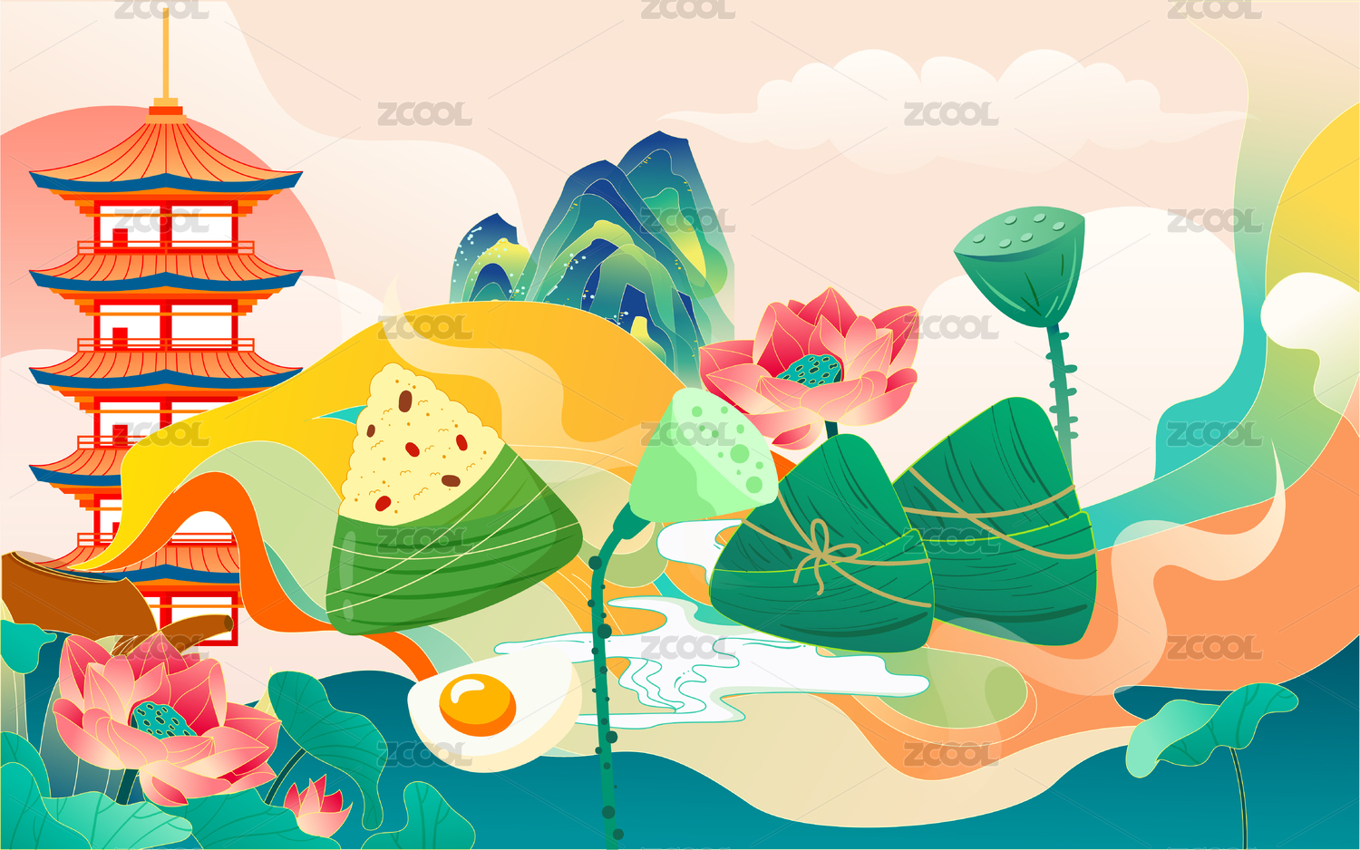 五月初五端午节快乐卡通粽子赛龙舟国潮插画