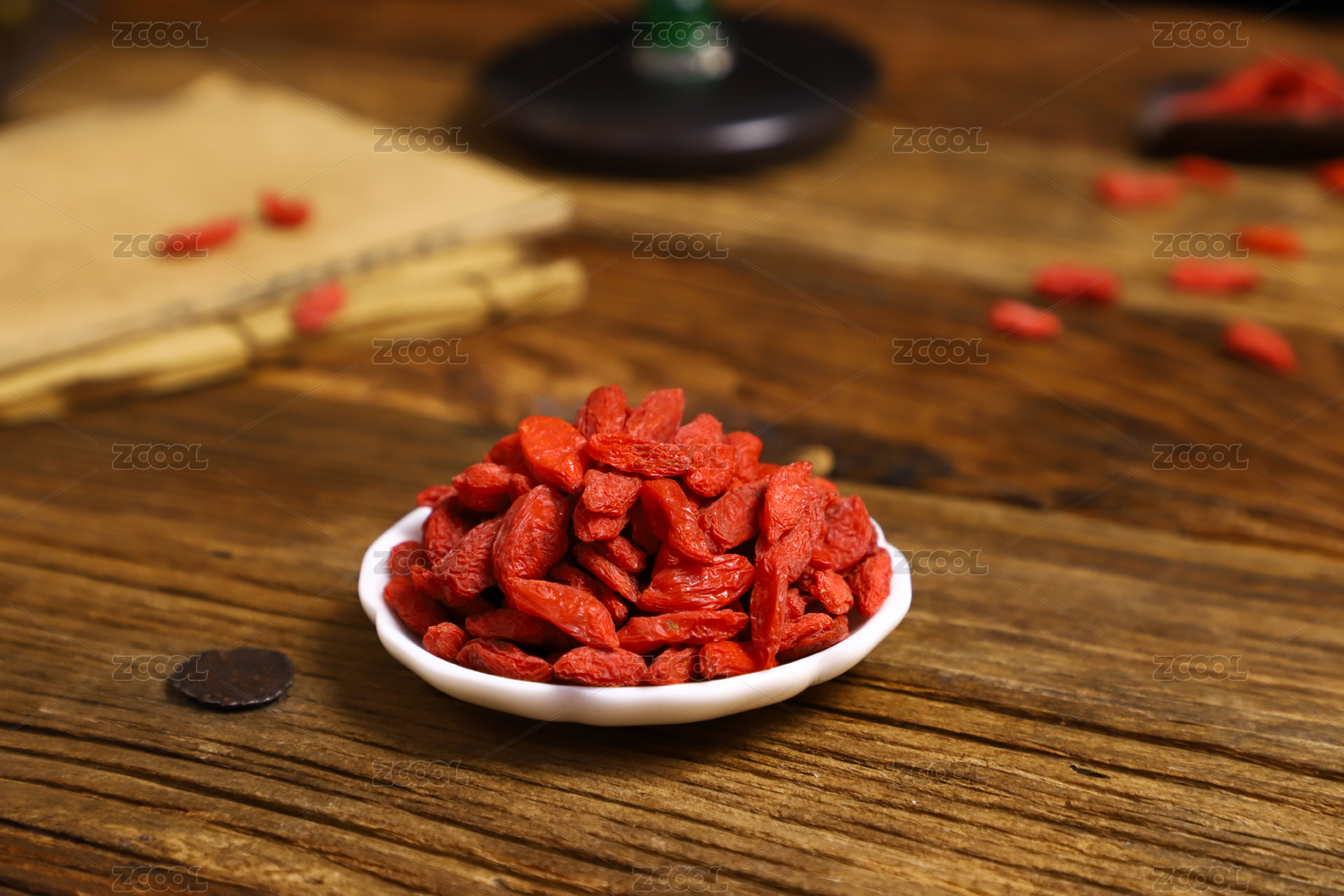 枸杞枸杞茶特写古窗棂木桌面深色调