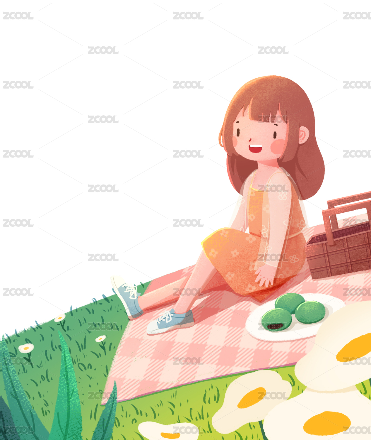 卡通手绘清明节女孩吃青团野餐郊游春游