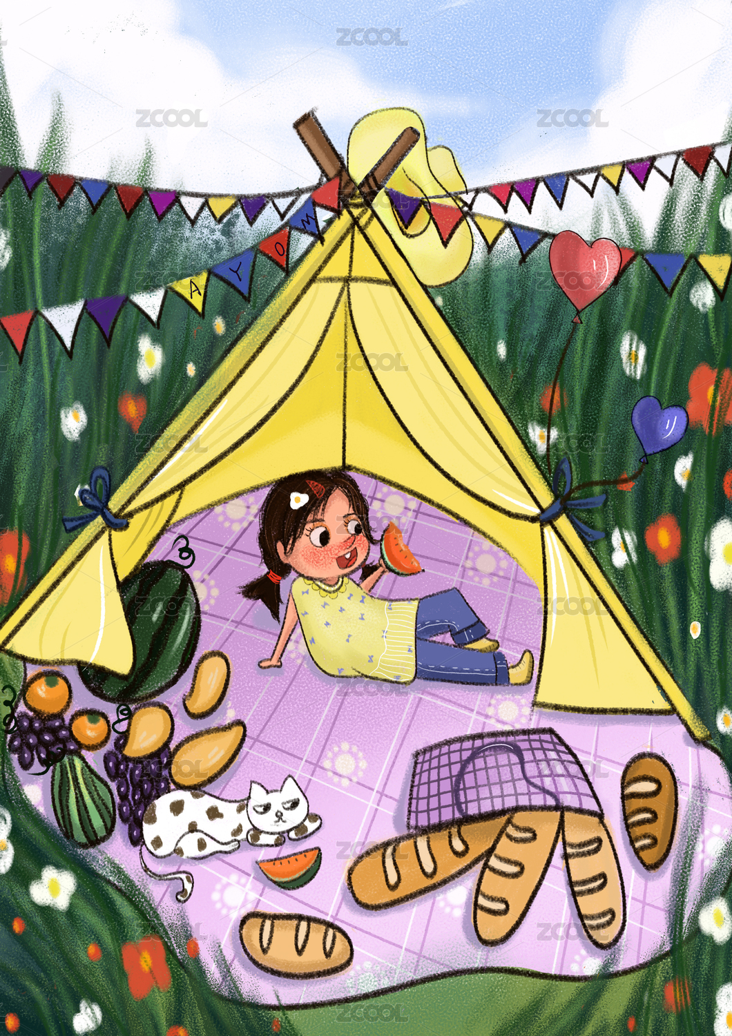 儿童插画,野餐,户外,愉快,可爱,女孩,小清新,植物,动物,春天