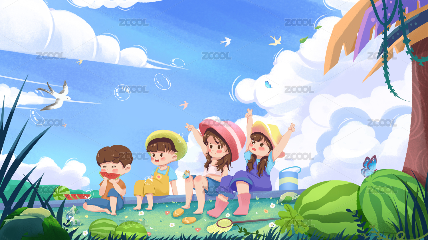 炎炎夏日的午后三个小伙伴在吃雪糕吃西瓜