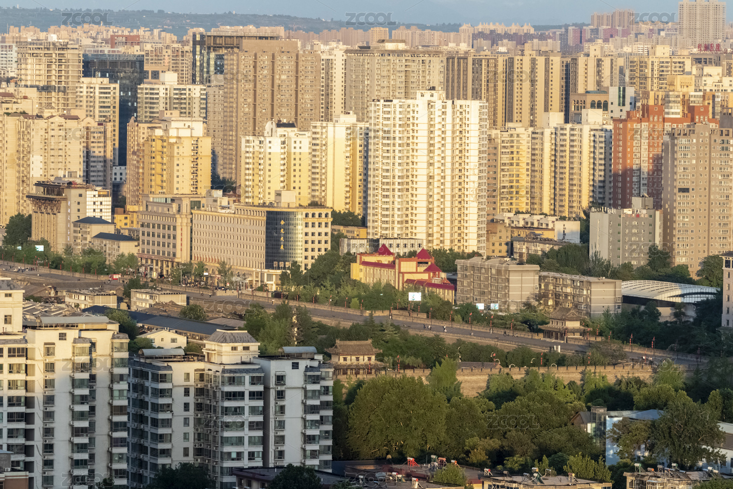 俯瞰黄昏金光中的北京繁华城市密集建筑群