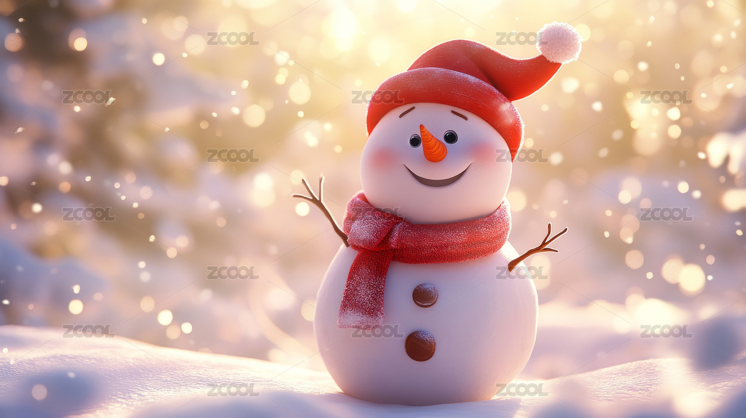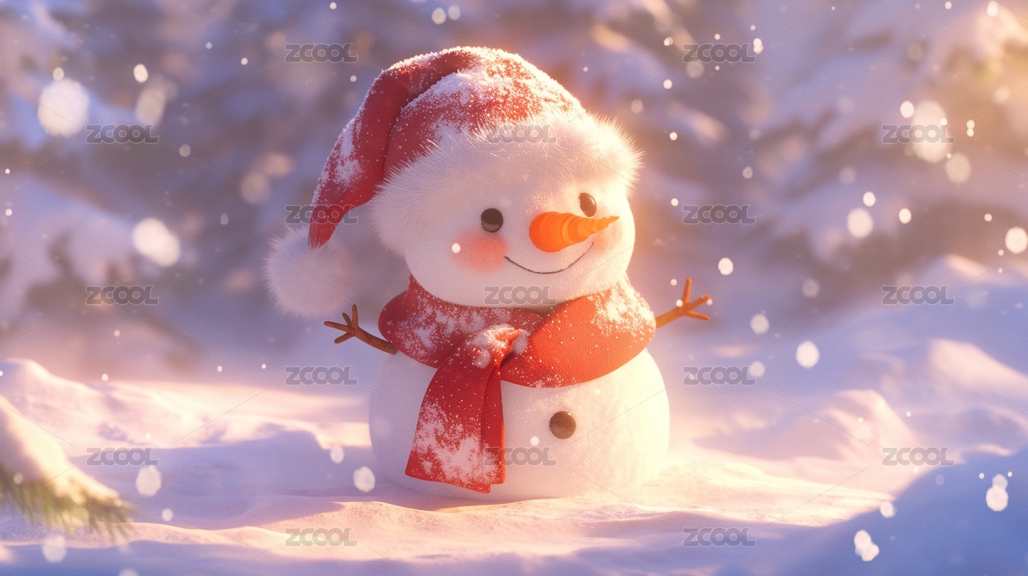 寒冷冬季阳光下的雪人3D立体卡通插画