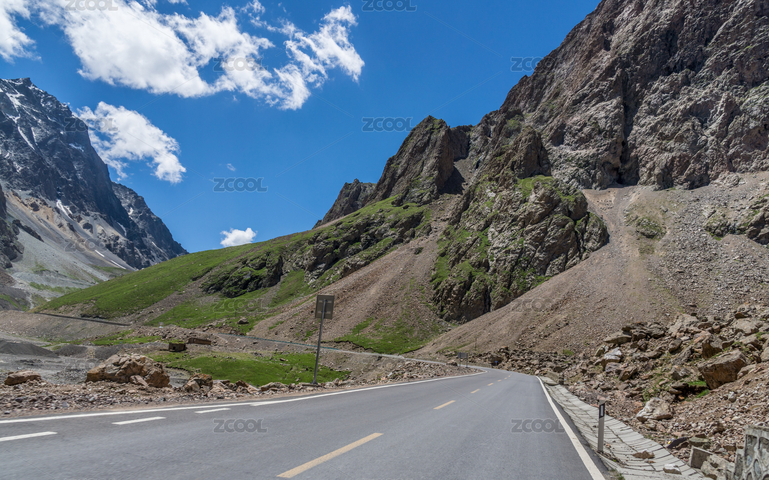 中国新疆夏季蓝天白云下高山草原G217独库公路弯道特写