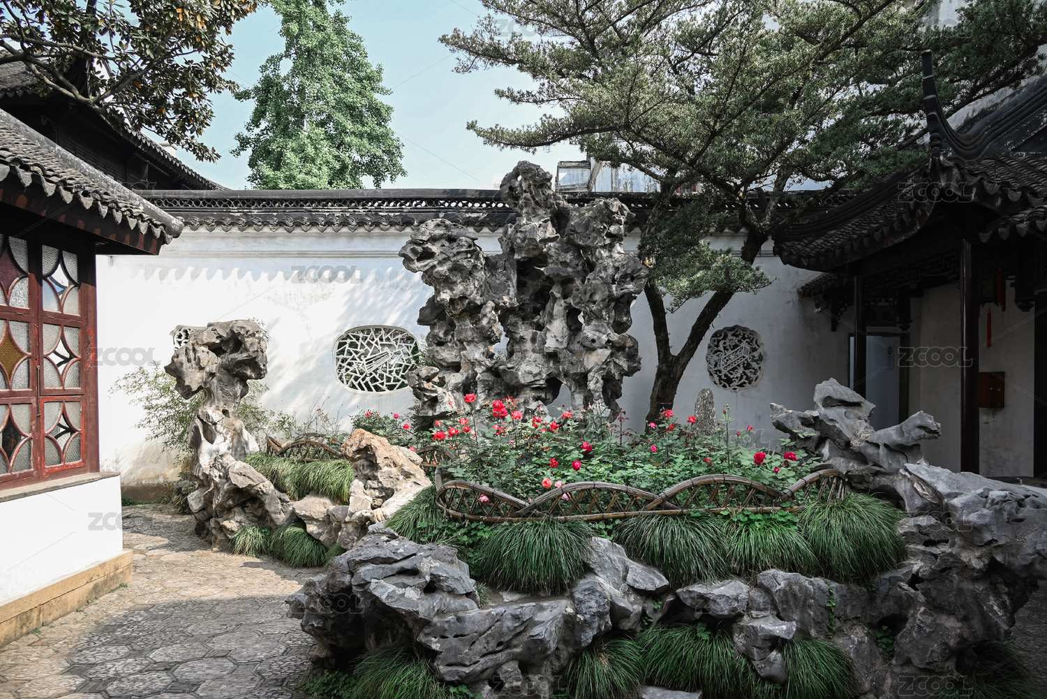 中国苏州园林的假山与花窗