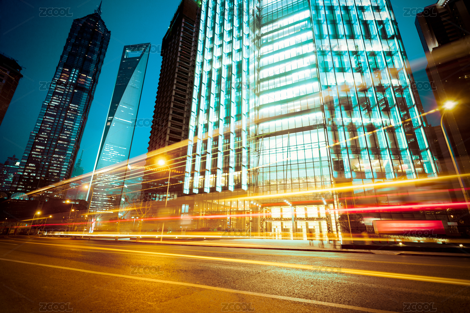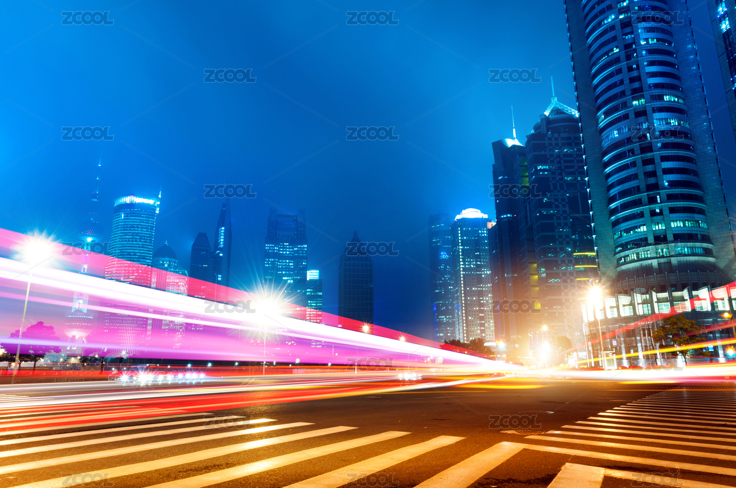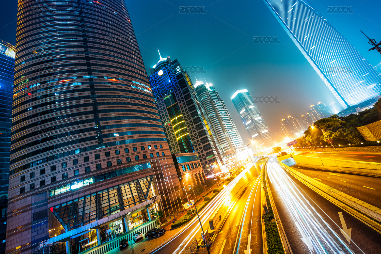上海陆家嘴金融区建筑夜景和城市街道车流光影轨迹
