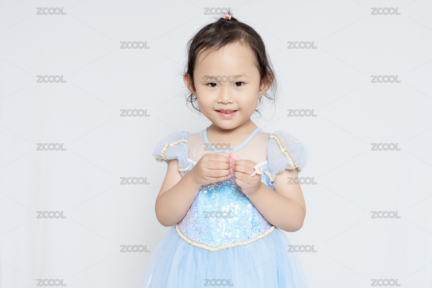 穿着蓝色公主裙怀抱站着的3岁女孩