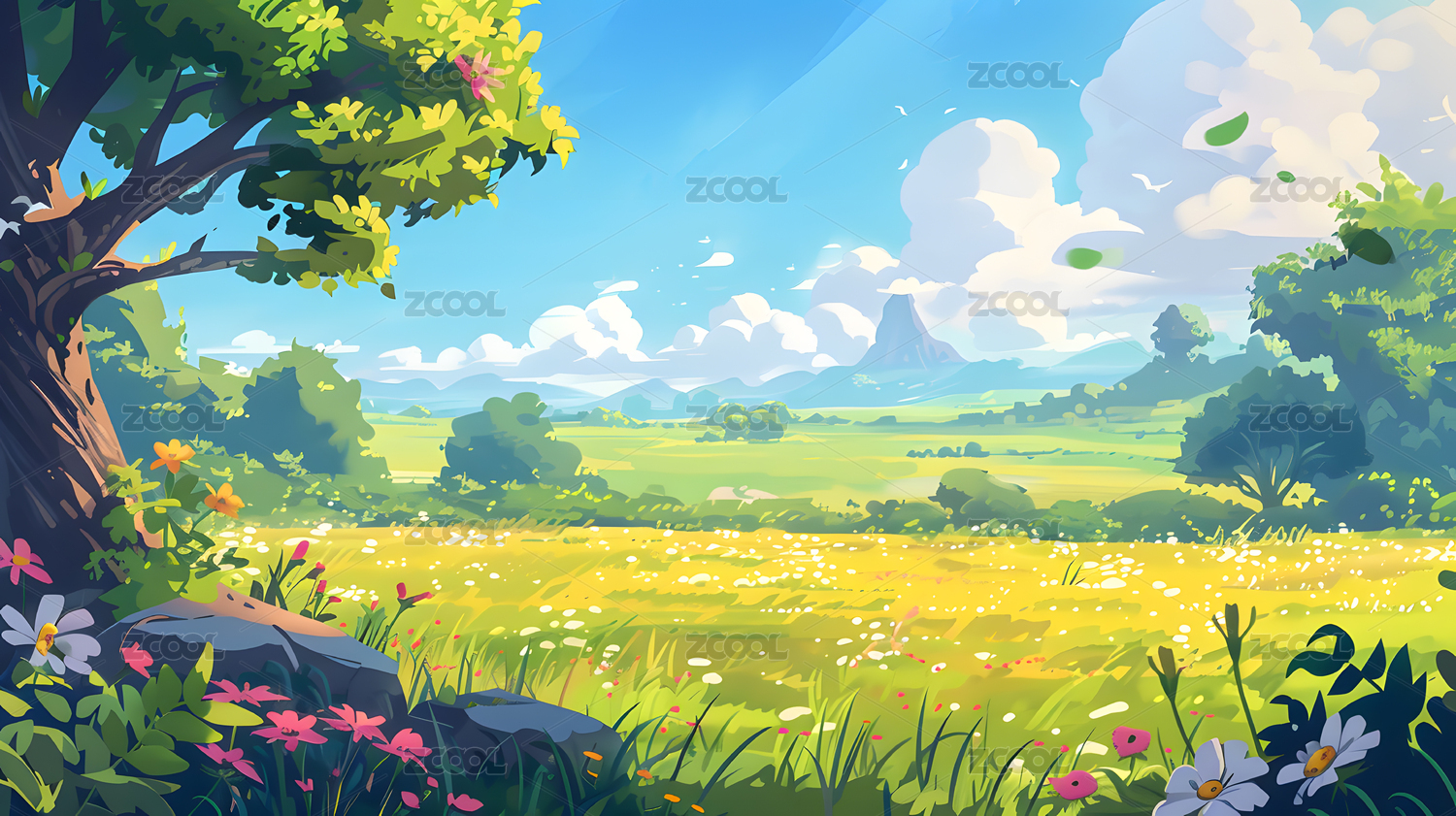 动物,户外,自然,插画,森林,牛,牲畜,树,太阳