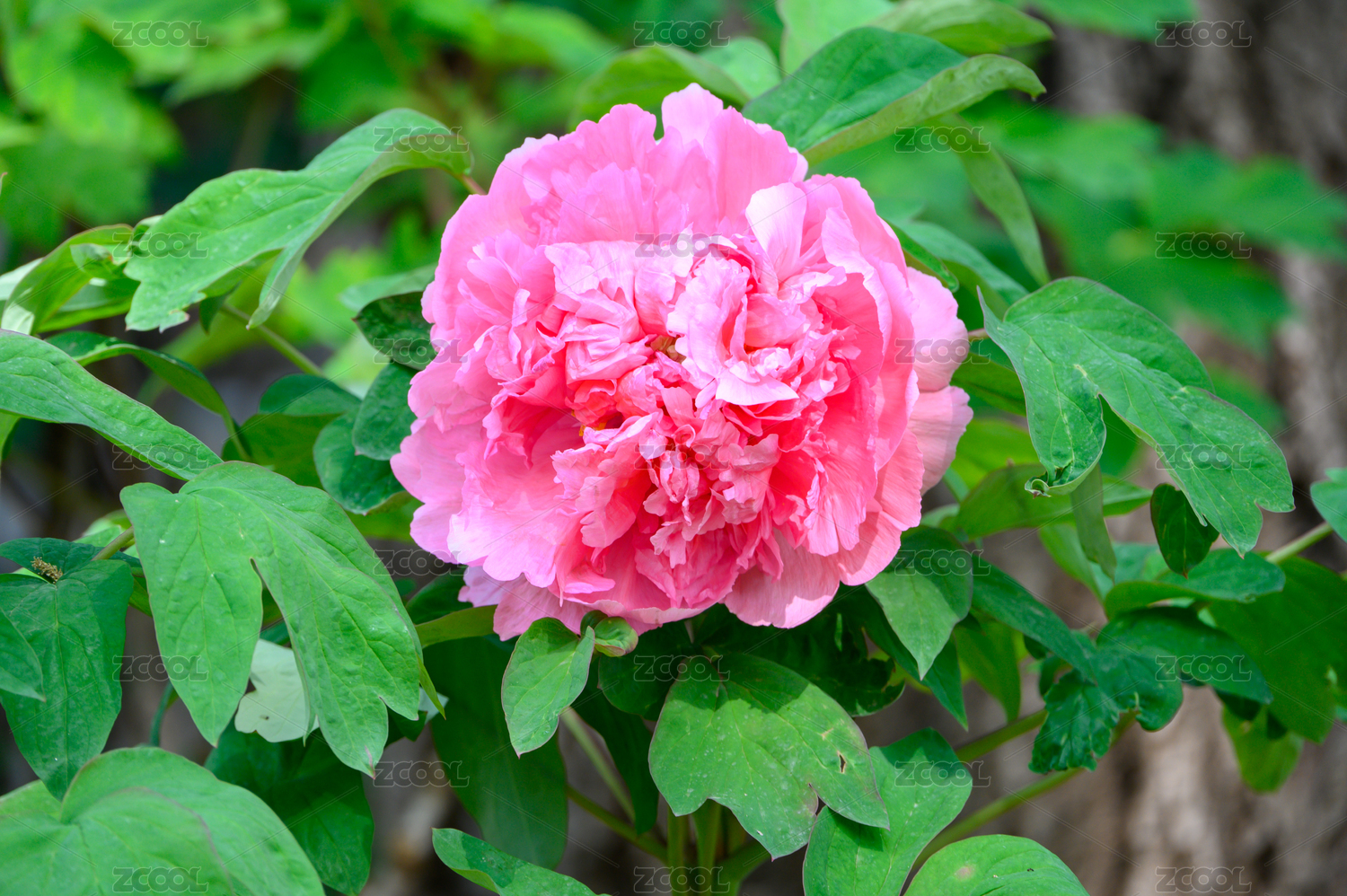 春天早晨阳光下盛开国色天香牡丹花篱笆
