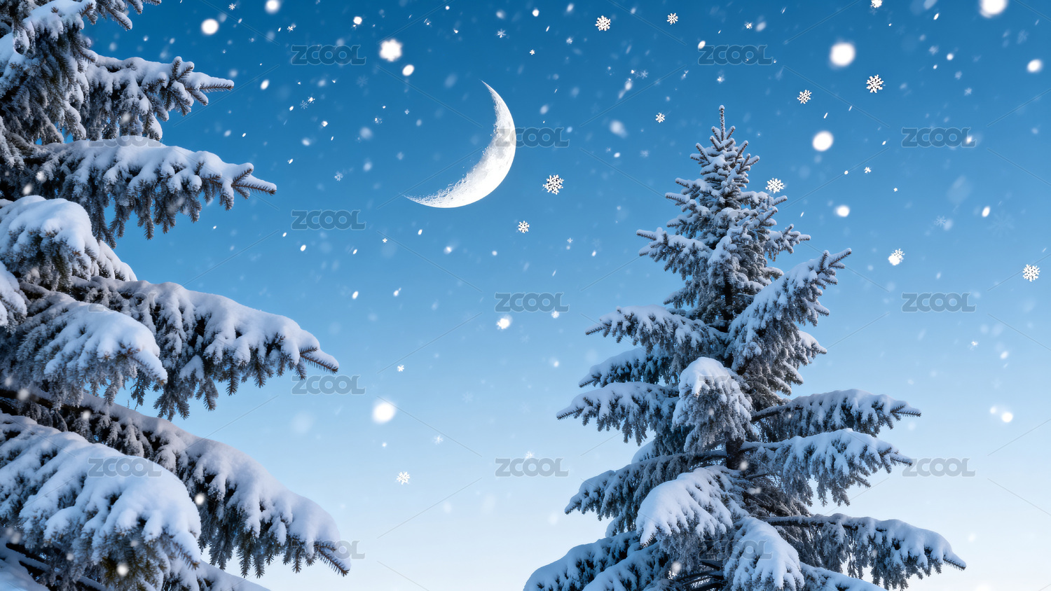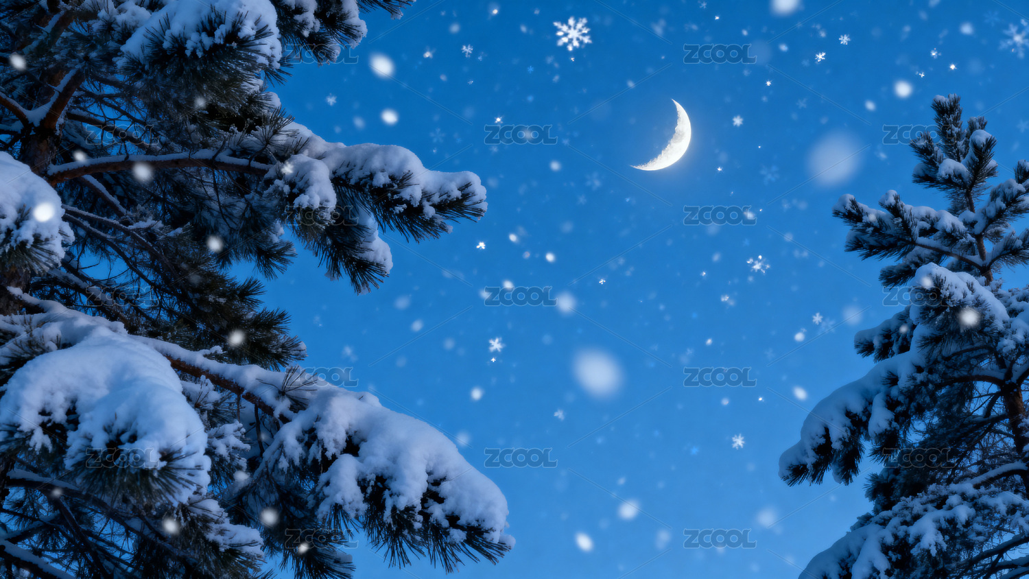 雪夜松枝映弯月冬夜飘雪
