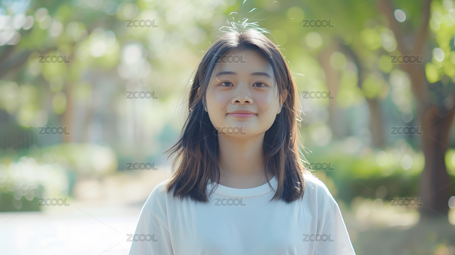 户外公园夕阳下逆光拍摄的亚洲美少女