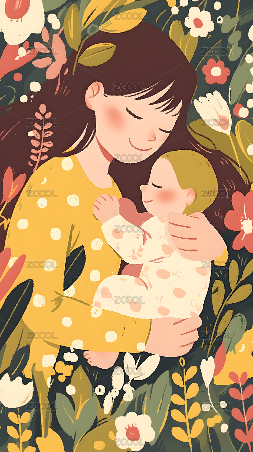 母亲节妈妈抱着萌娃竖版插画矢量图