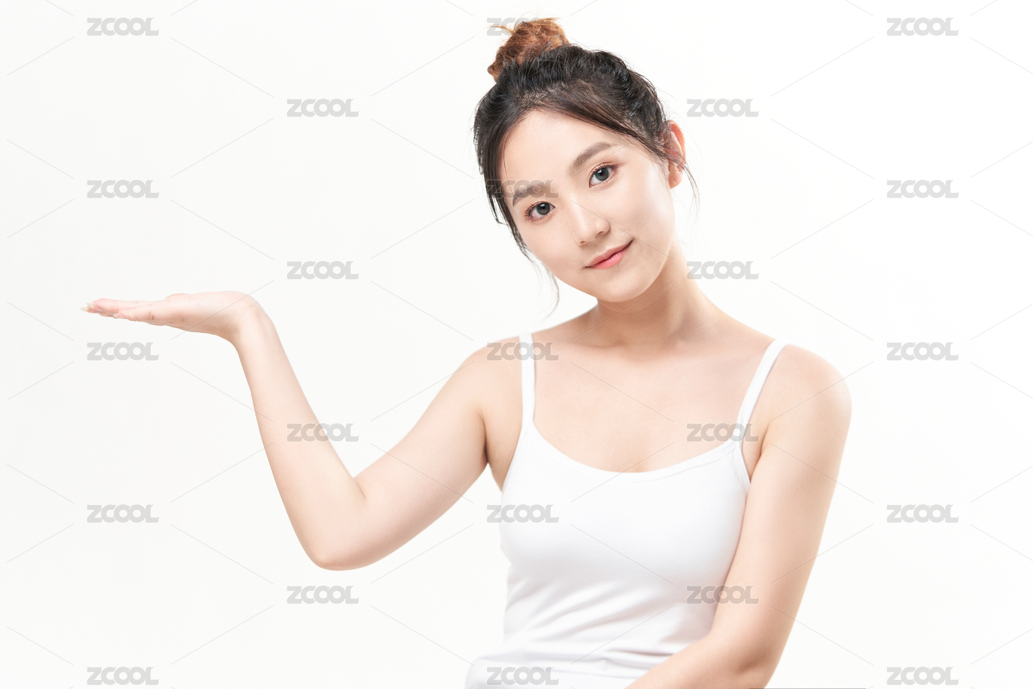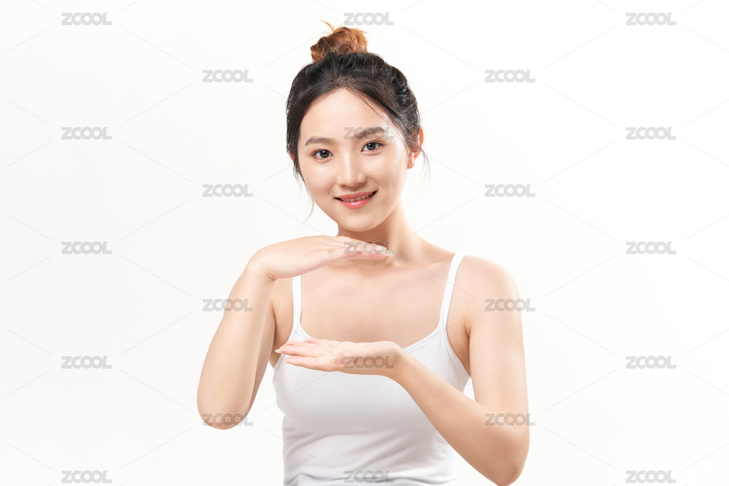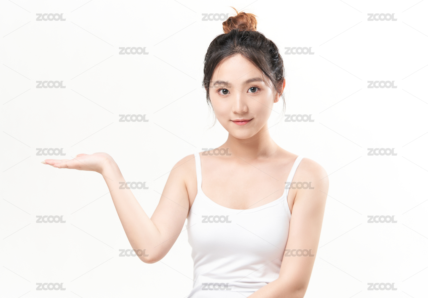 白色背景前托着产品的东方美女