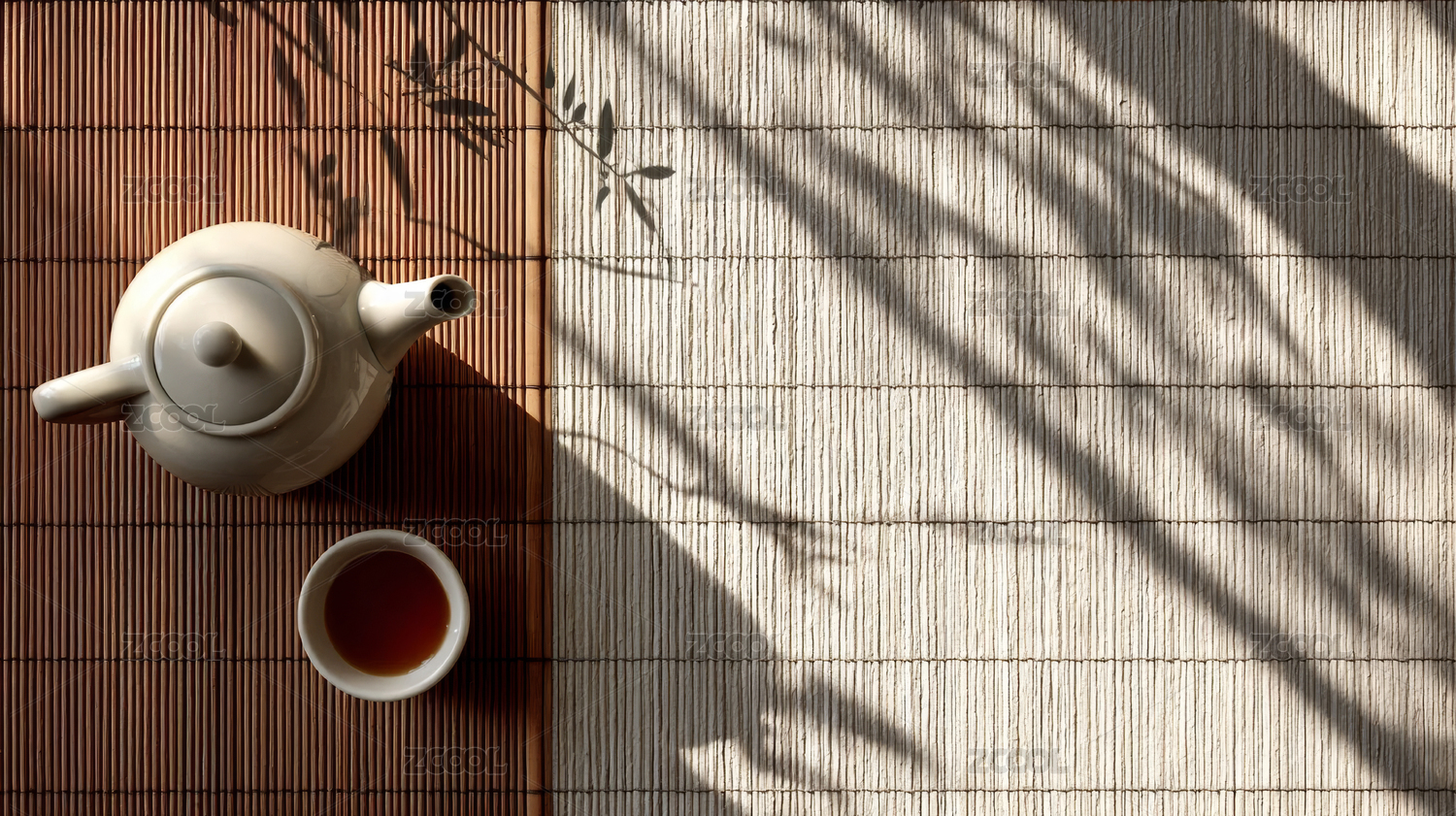 白色茶壶和茶杯在竹席上
