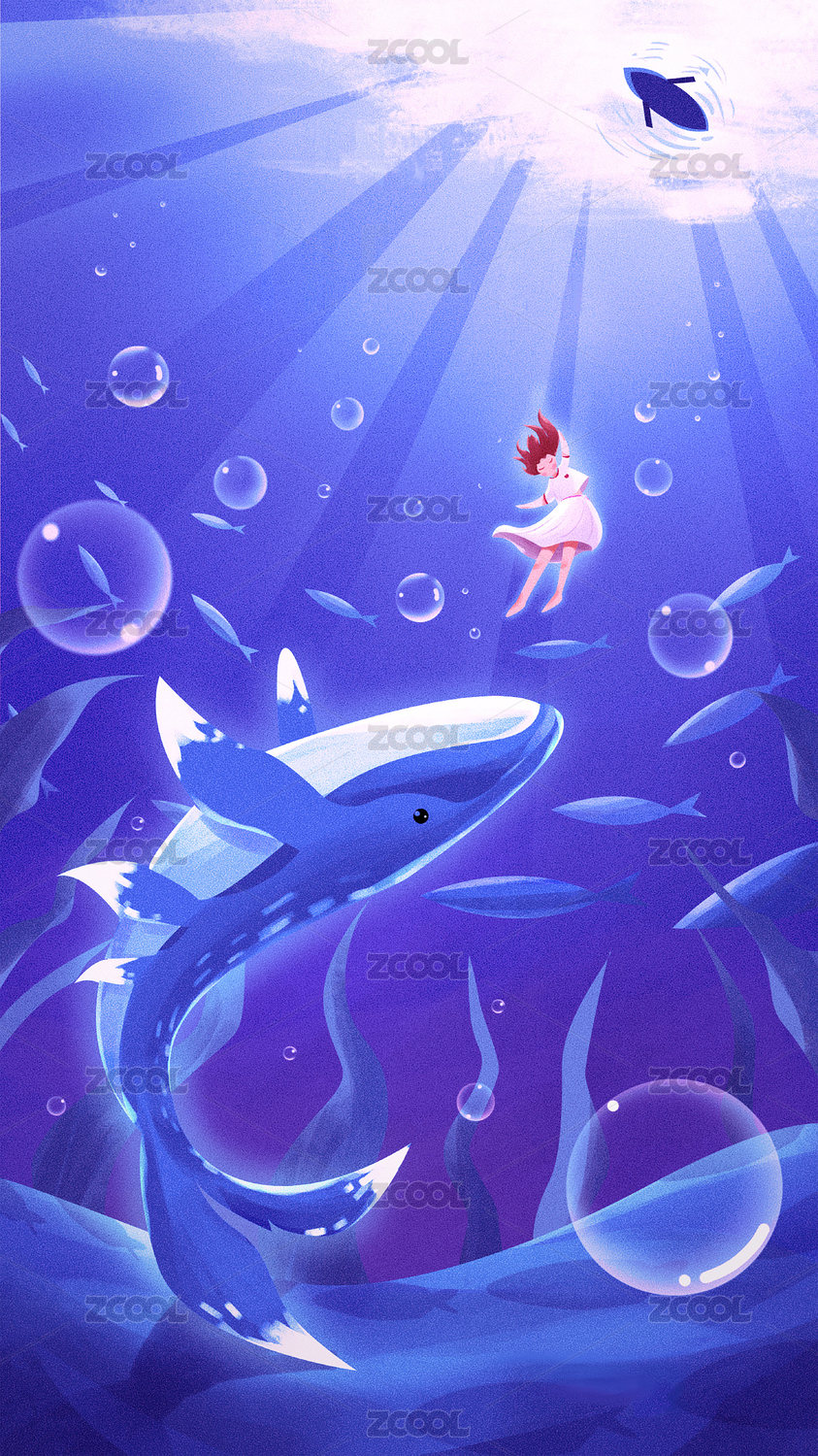 蓝色,海洋,鲸鱼,小姑娘,鱼群,泡泡,共舞,潜水,游泳,海水