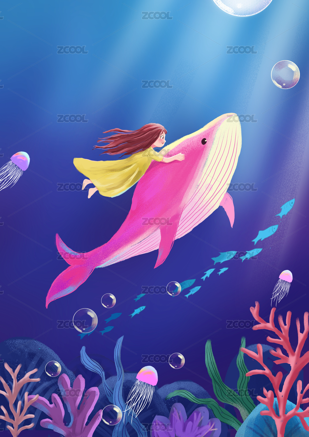 海底世界鲸鱼少女女孩扁平渐变插画背景