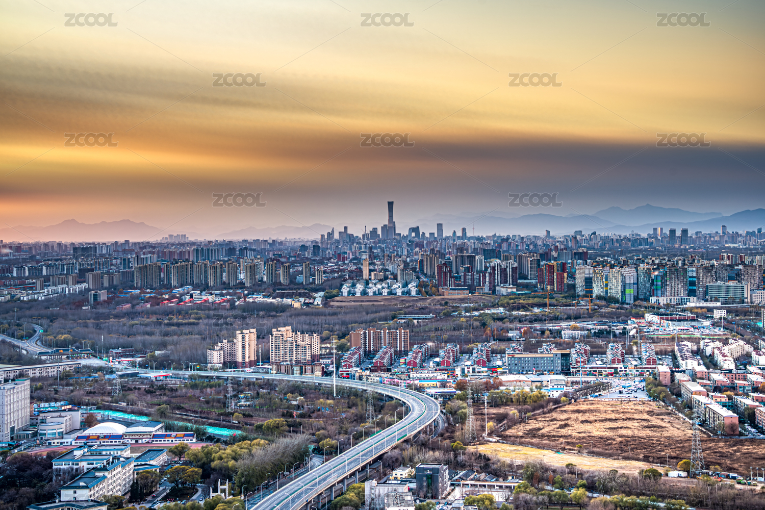 从景山公园最高点俯瞰冬日里的北京城市风光