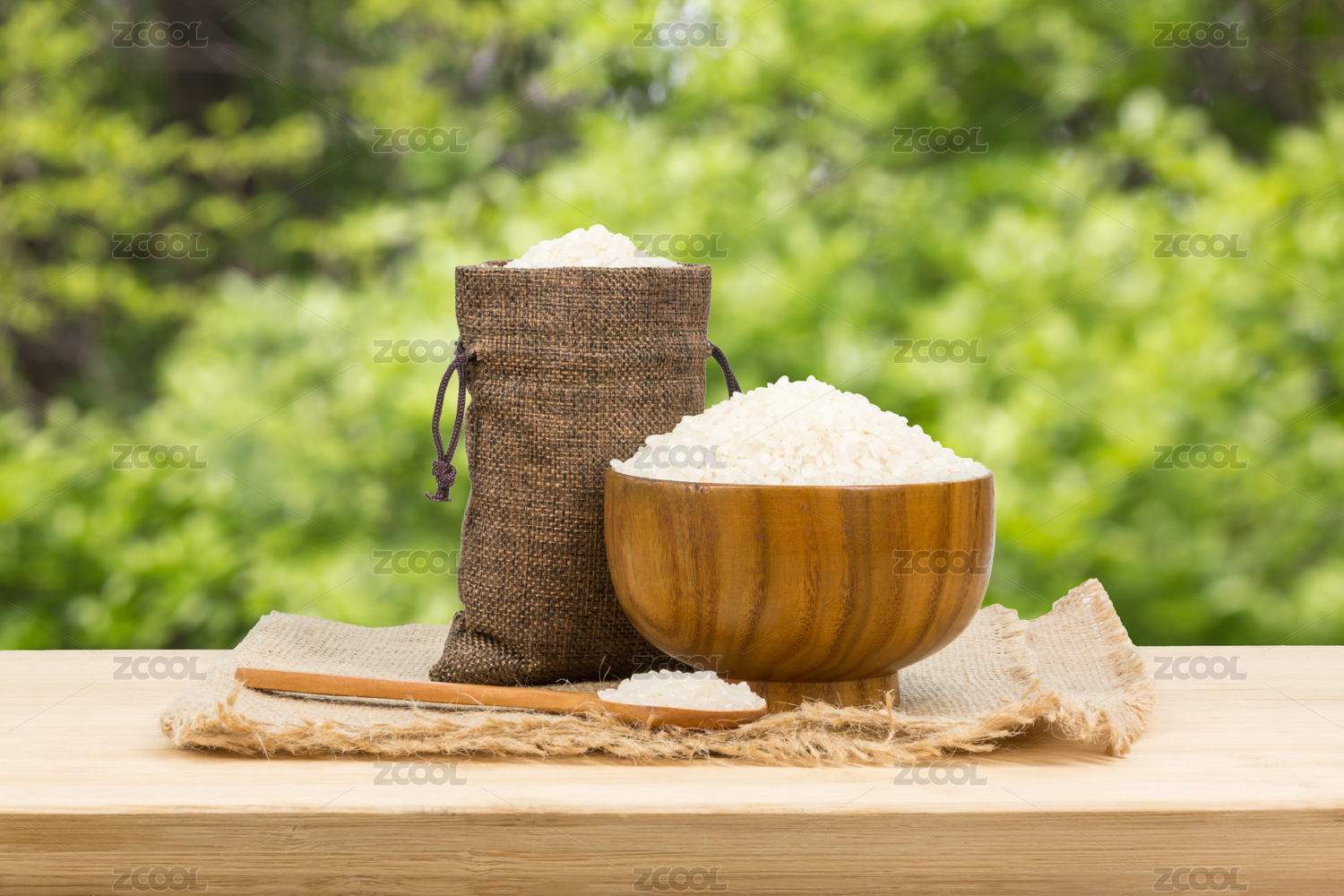 盛有大米的木碗和木勺放在浅蓝色的餐布上