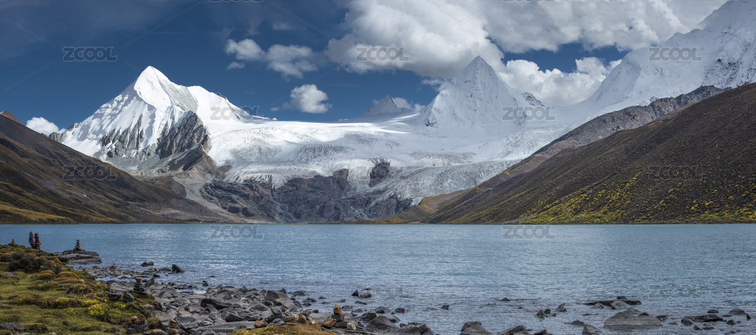 大自然户外旅行徒步雪山湖水湖边岩石背景