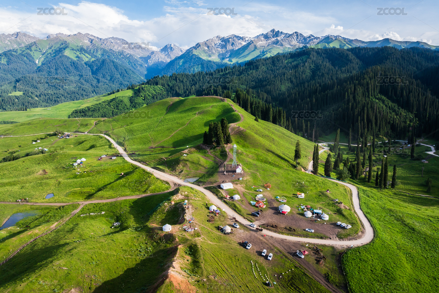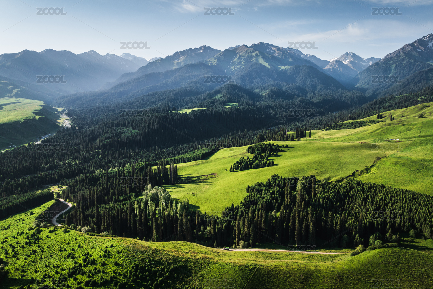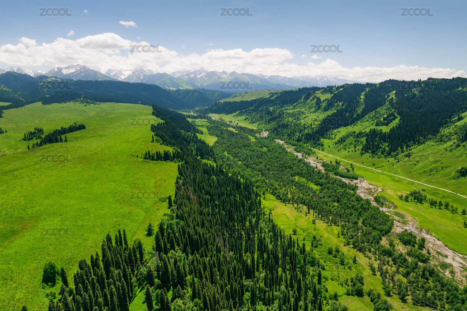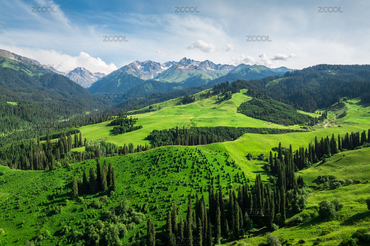 乡村,云杉,伊犁,夏天,大自然,山峰,山脉,山谷,巩留县,恰西草原