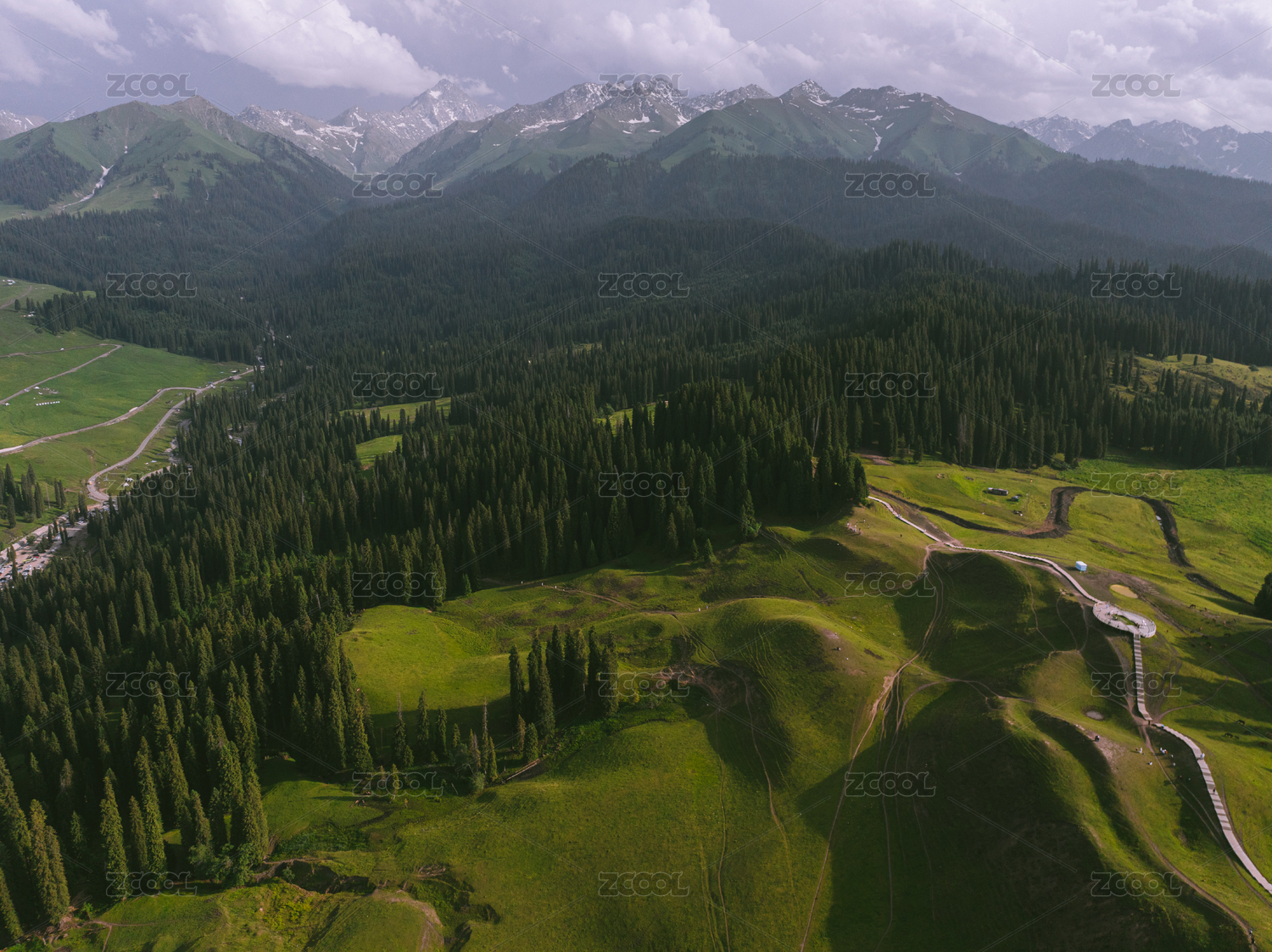 中国新疆伊犁库尔德宁草原森林自然风光航拍