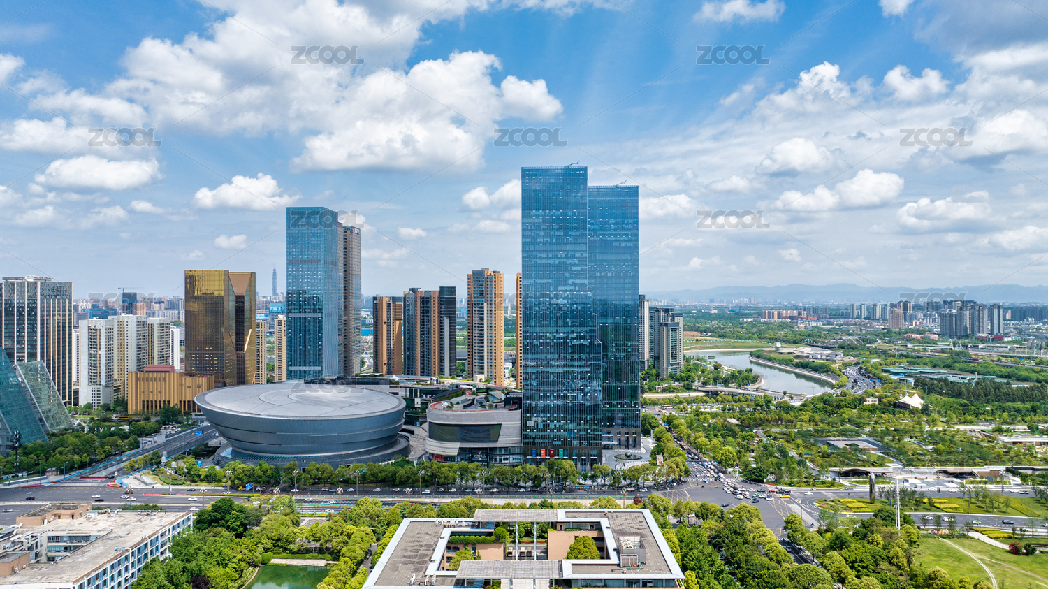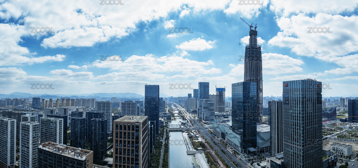 夏天高温晴朗天气航拍杭州未来科技城高楼大