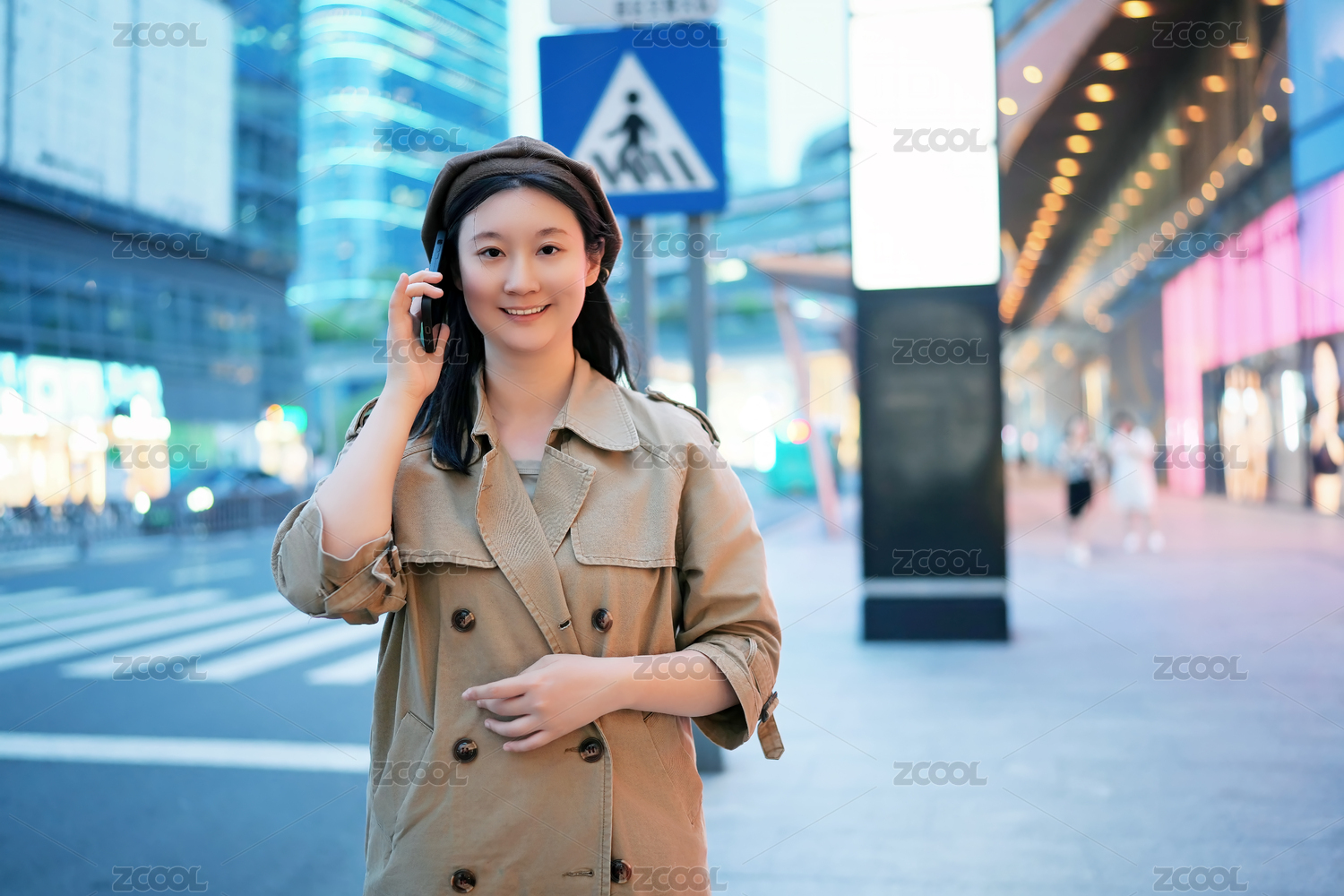 年轻女子穿行于城市的黄昏街道
