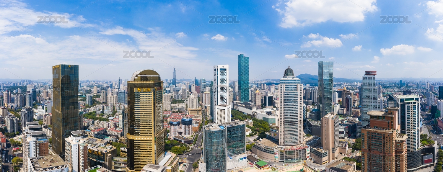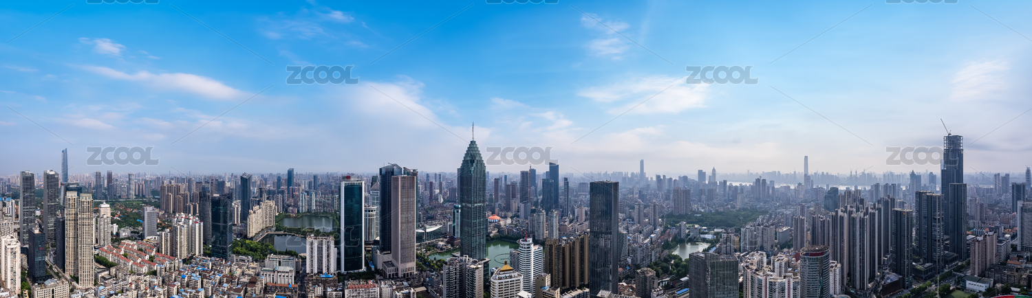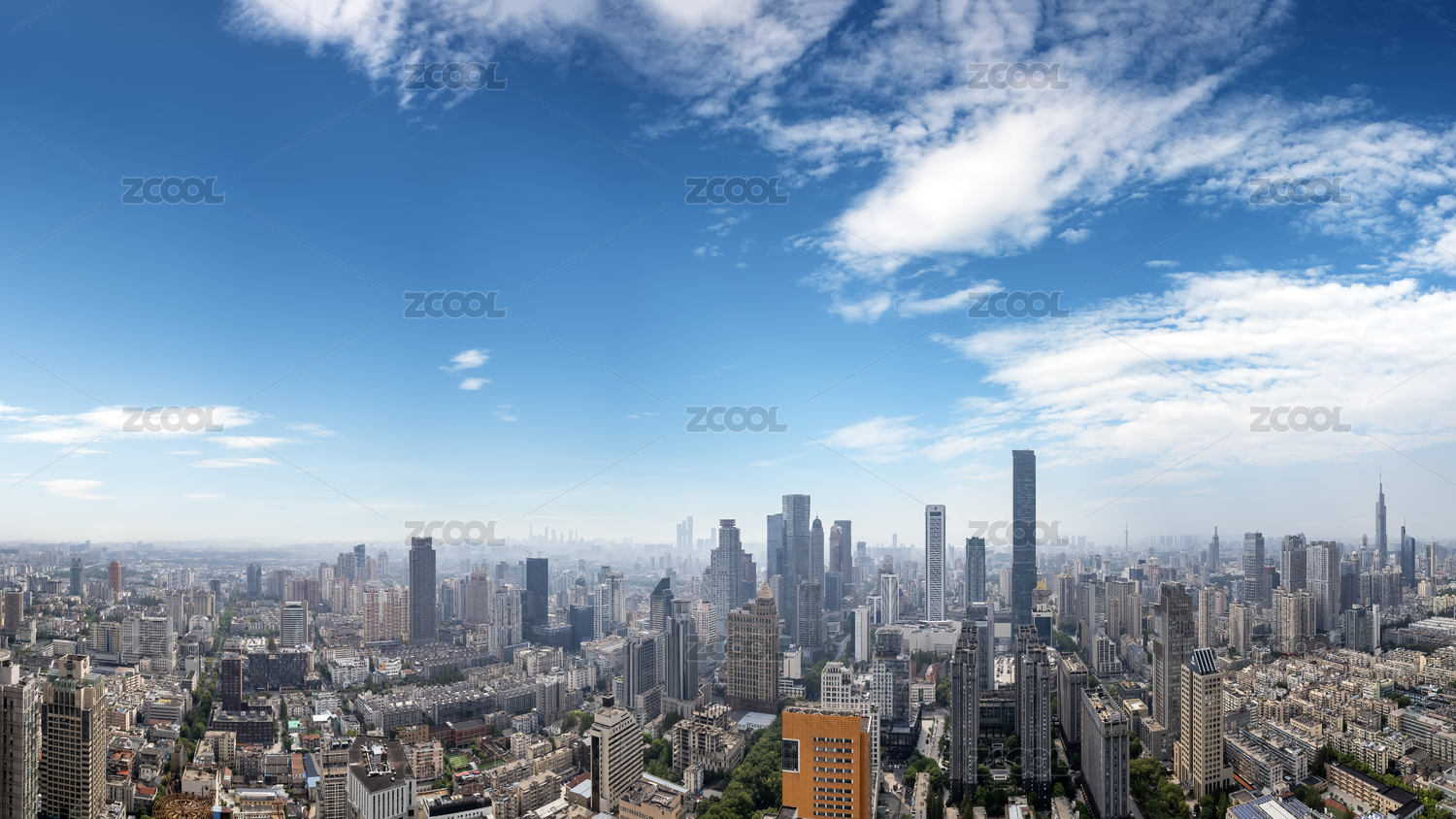 晴朗的蓝天下南京市中心新街口的高楼与城市天际线全景