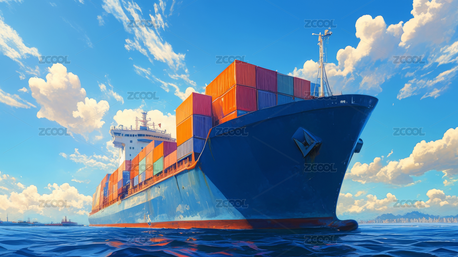 满载彩色集装箱货轮航行于蔚蓝海洋