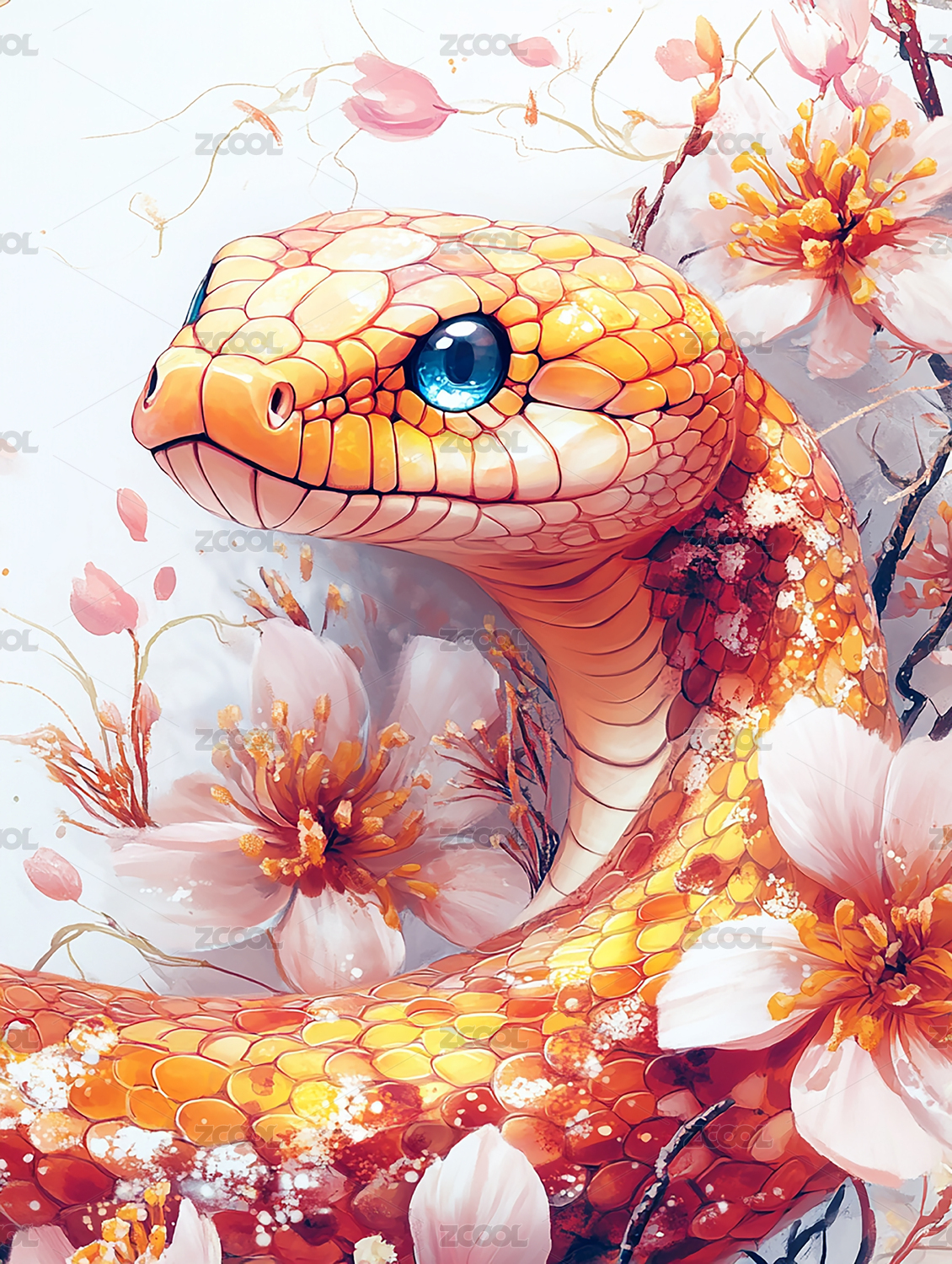 蛇和牡丹花插画