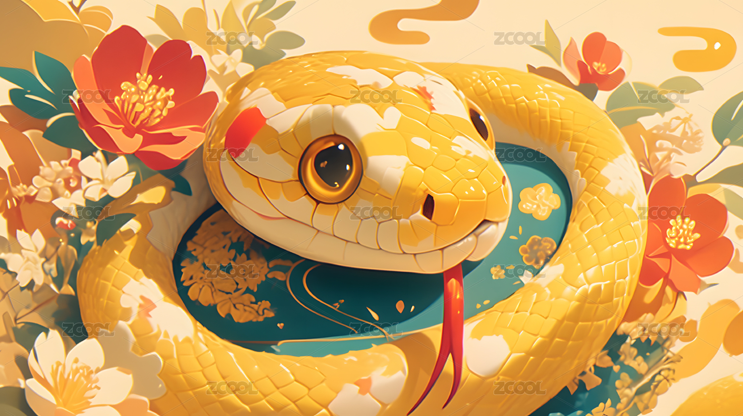 黄色蛇与花卉图案