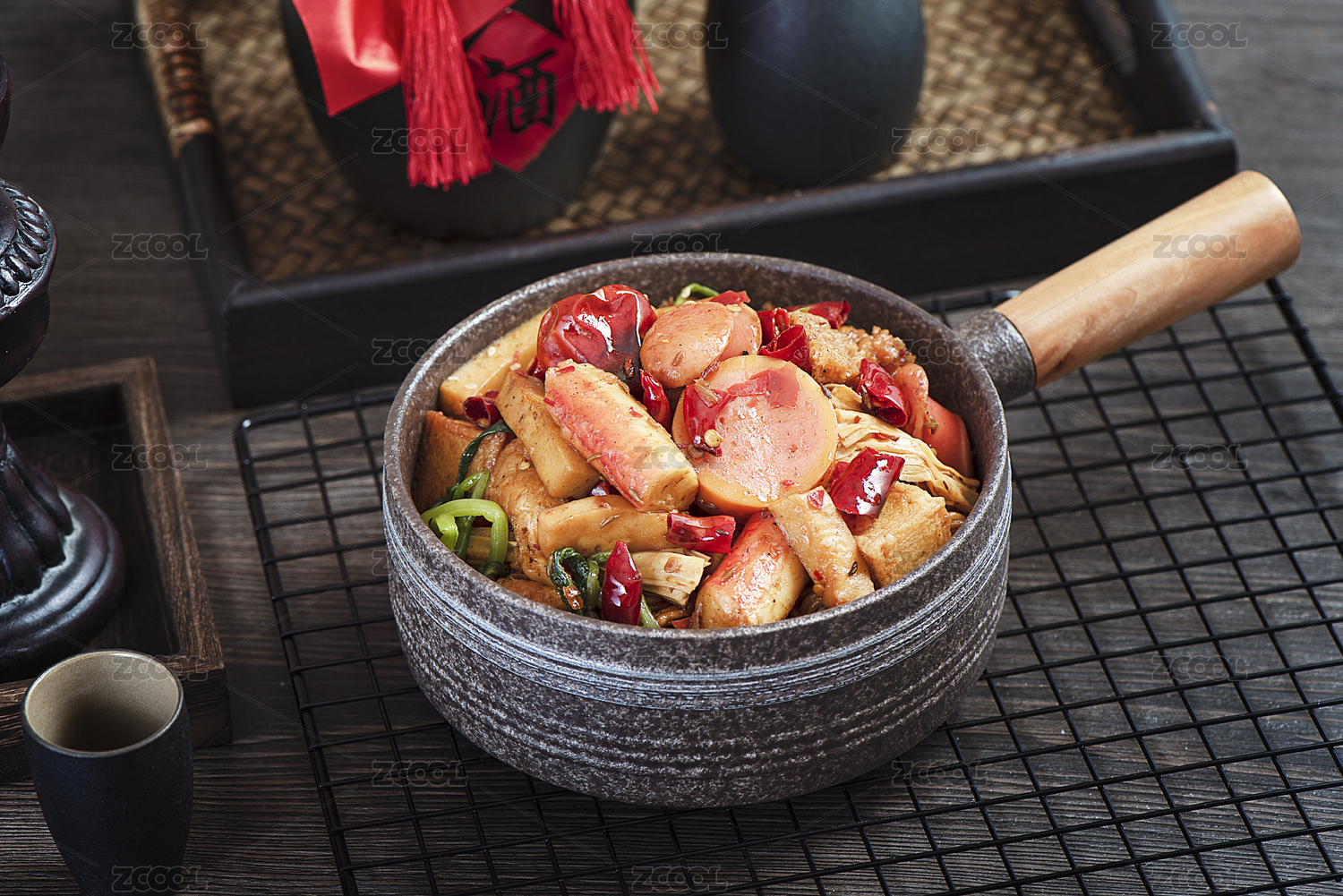 双耳铁锅里的麻辣鸡肉干锅香辣椒干锅