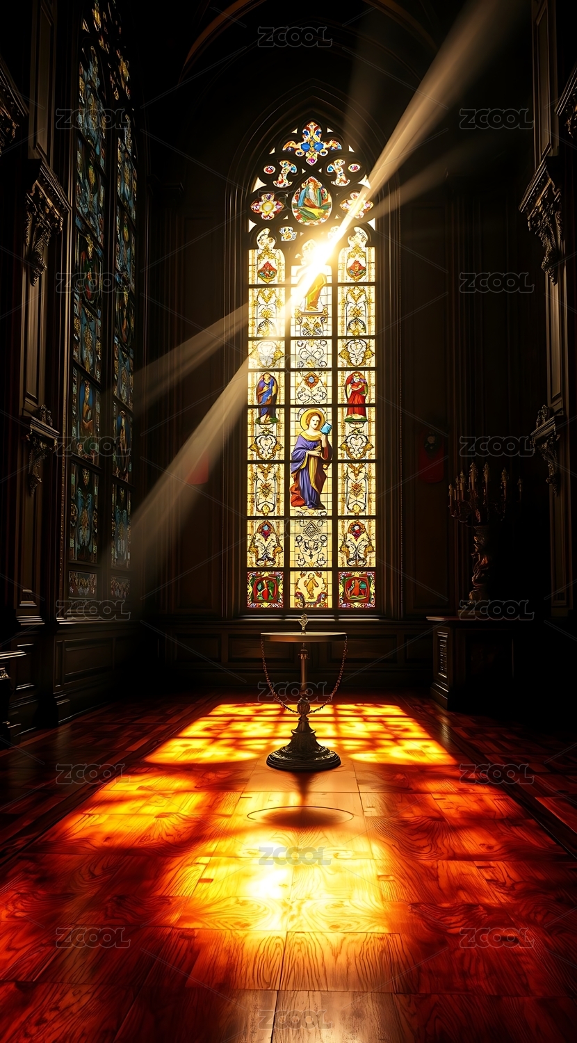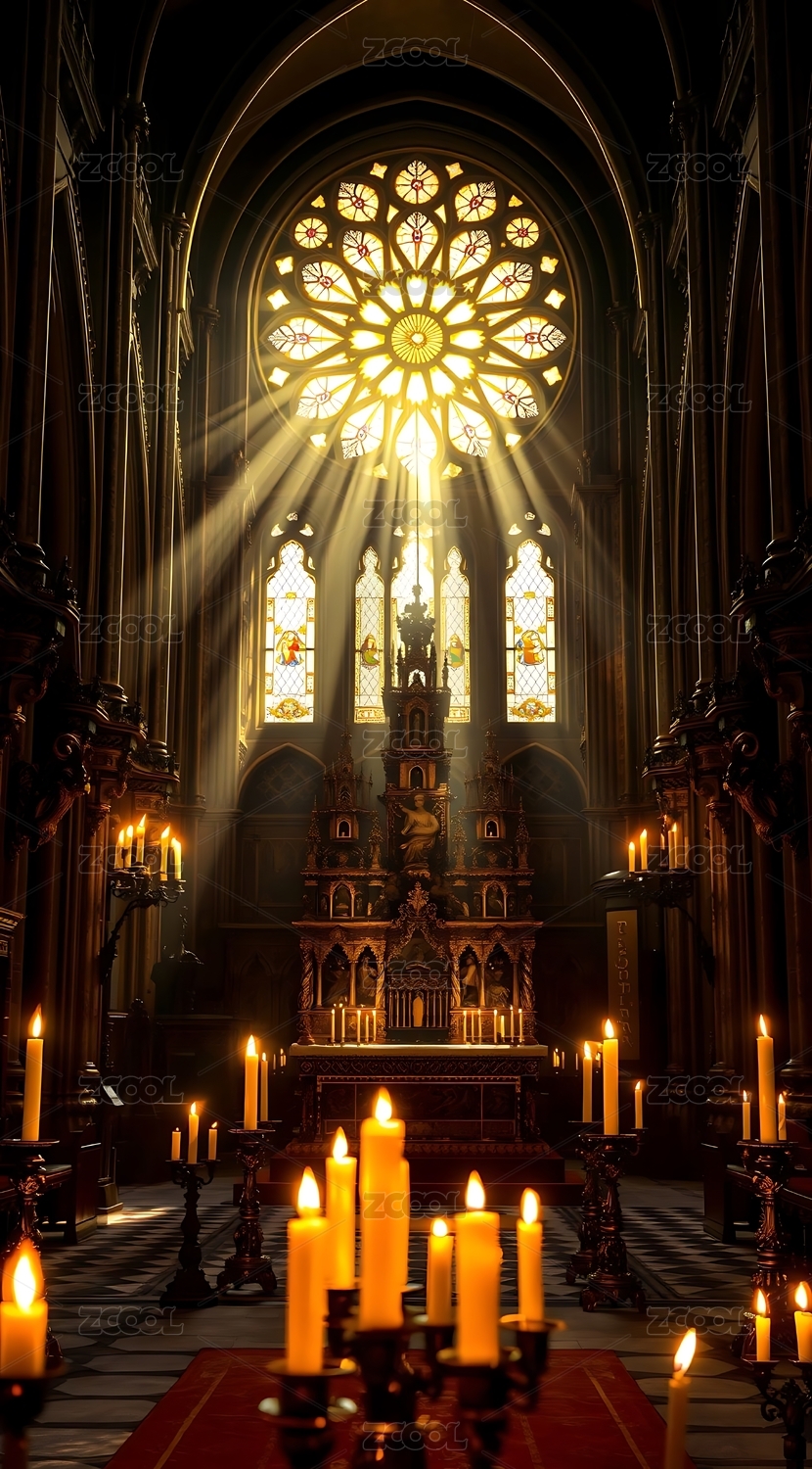 教堂内部阳光透过彩色玻璃窗洒落蜡烛点燃神圣庄严