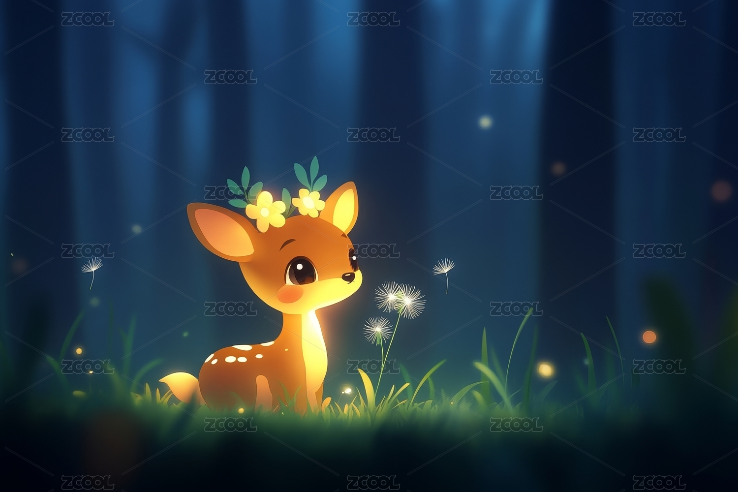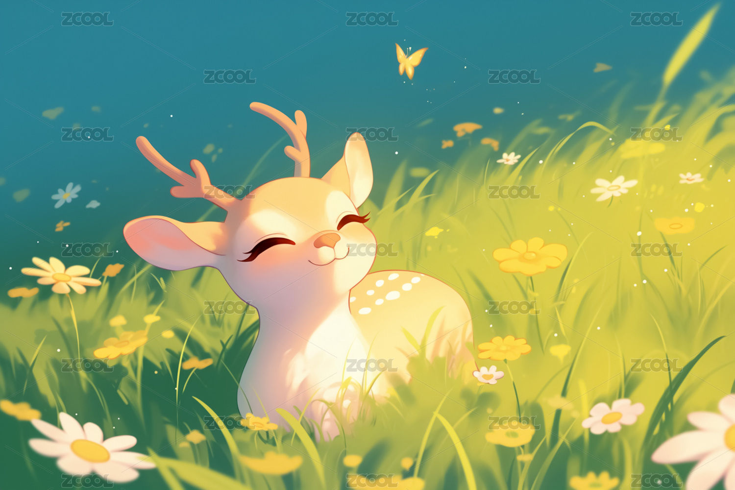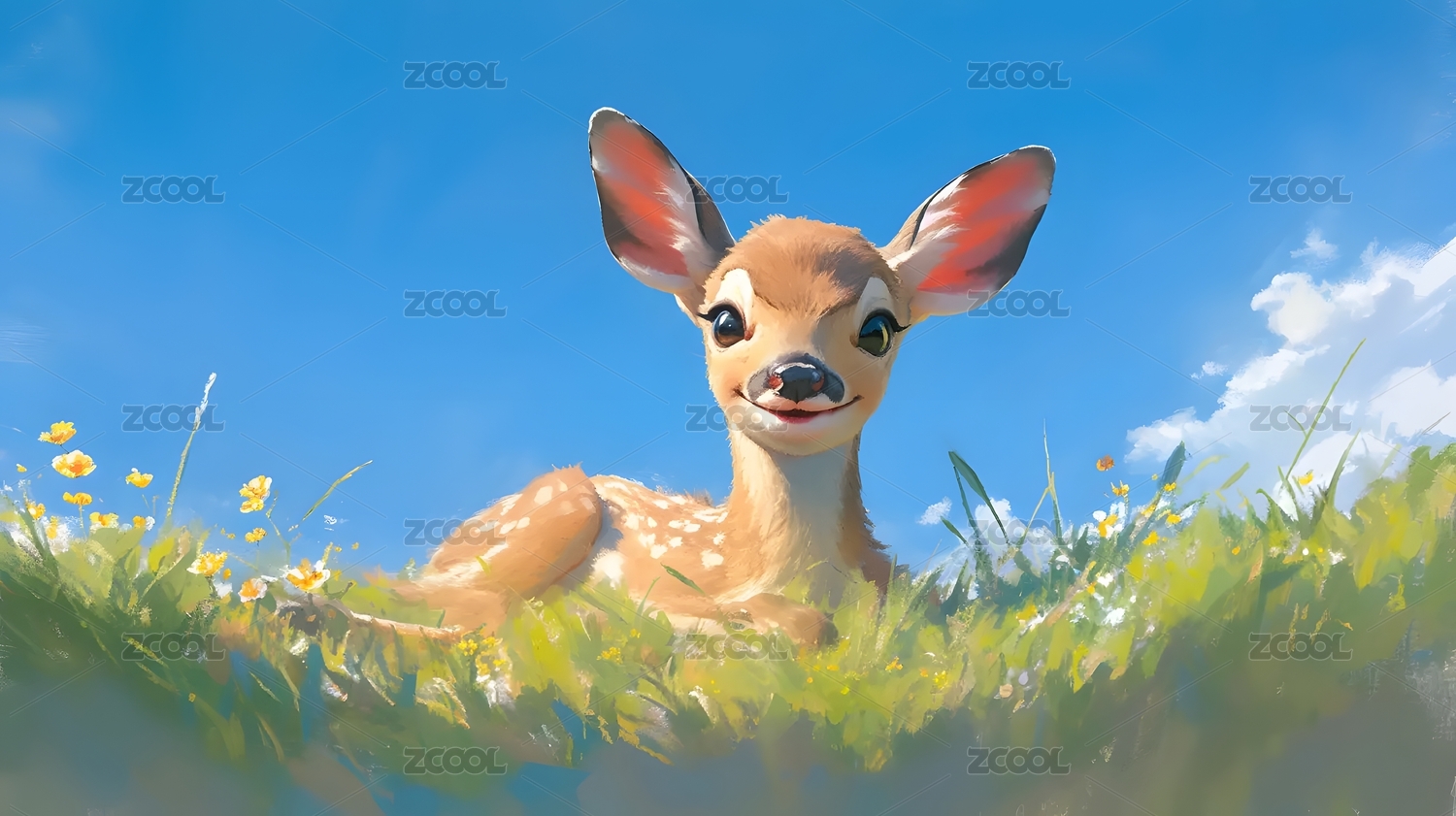 AIGC202401,动物,壁纸,蓝天,草地,花朵,可爱,插画,草,花