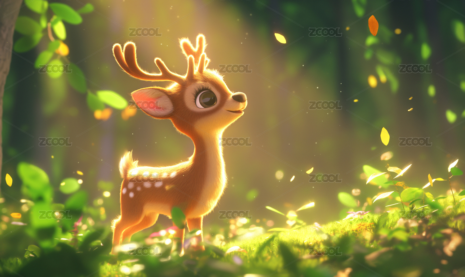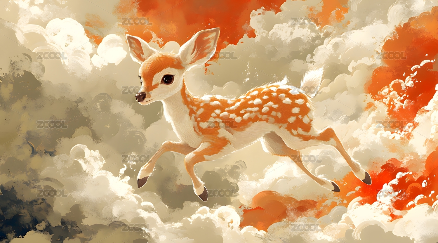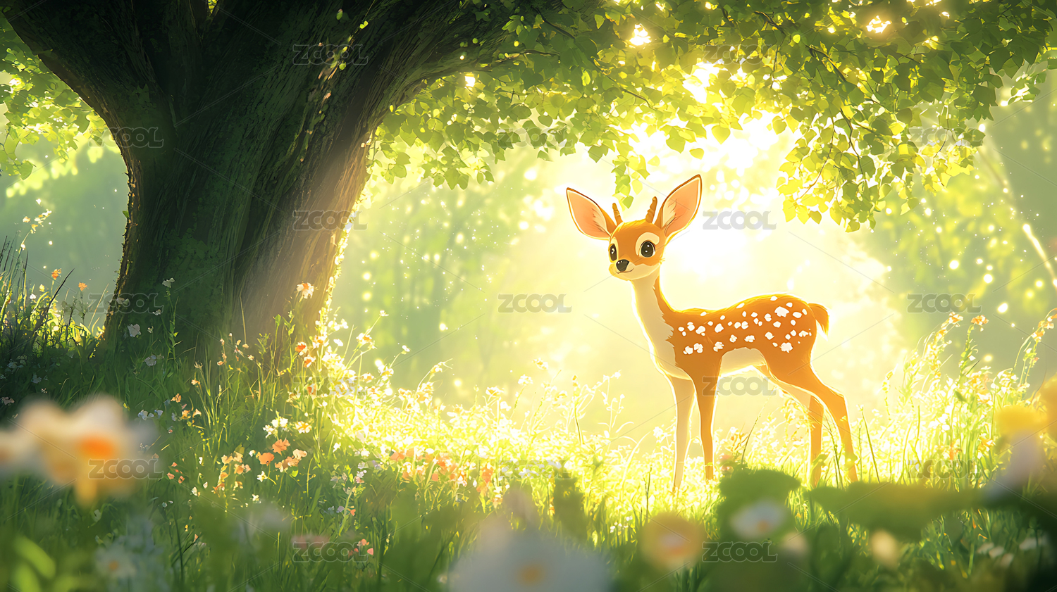 AIGC202401,动物,壁纸,蓝天,草地,花朵,可爱,插画,草,花