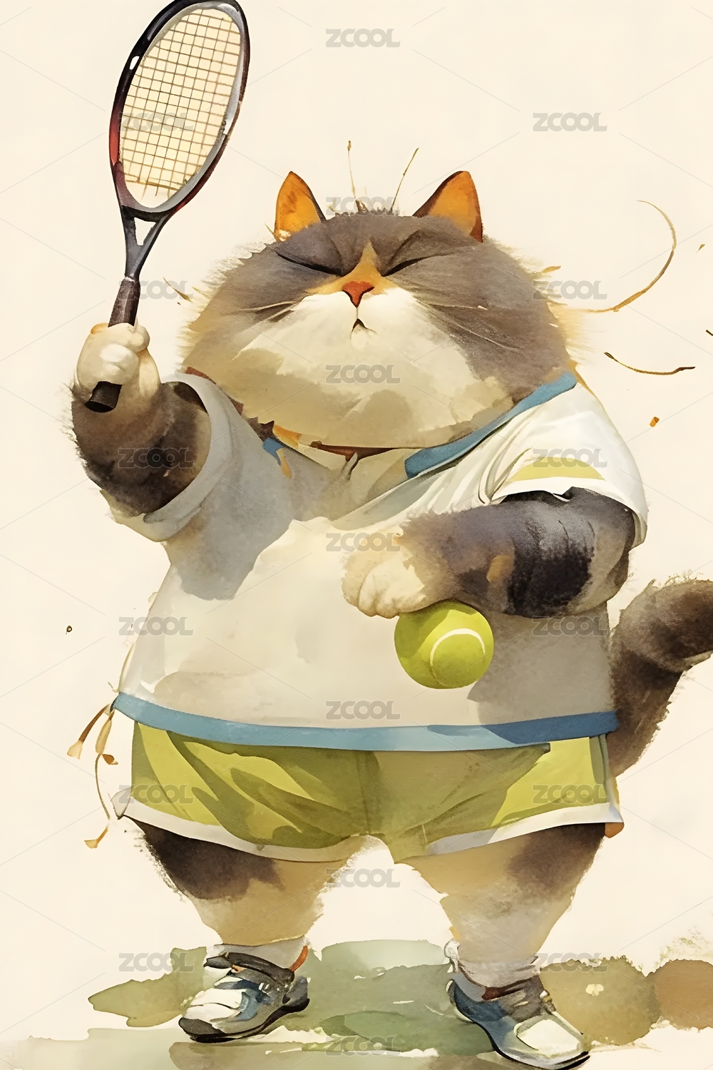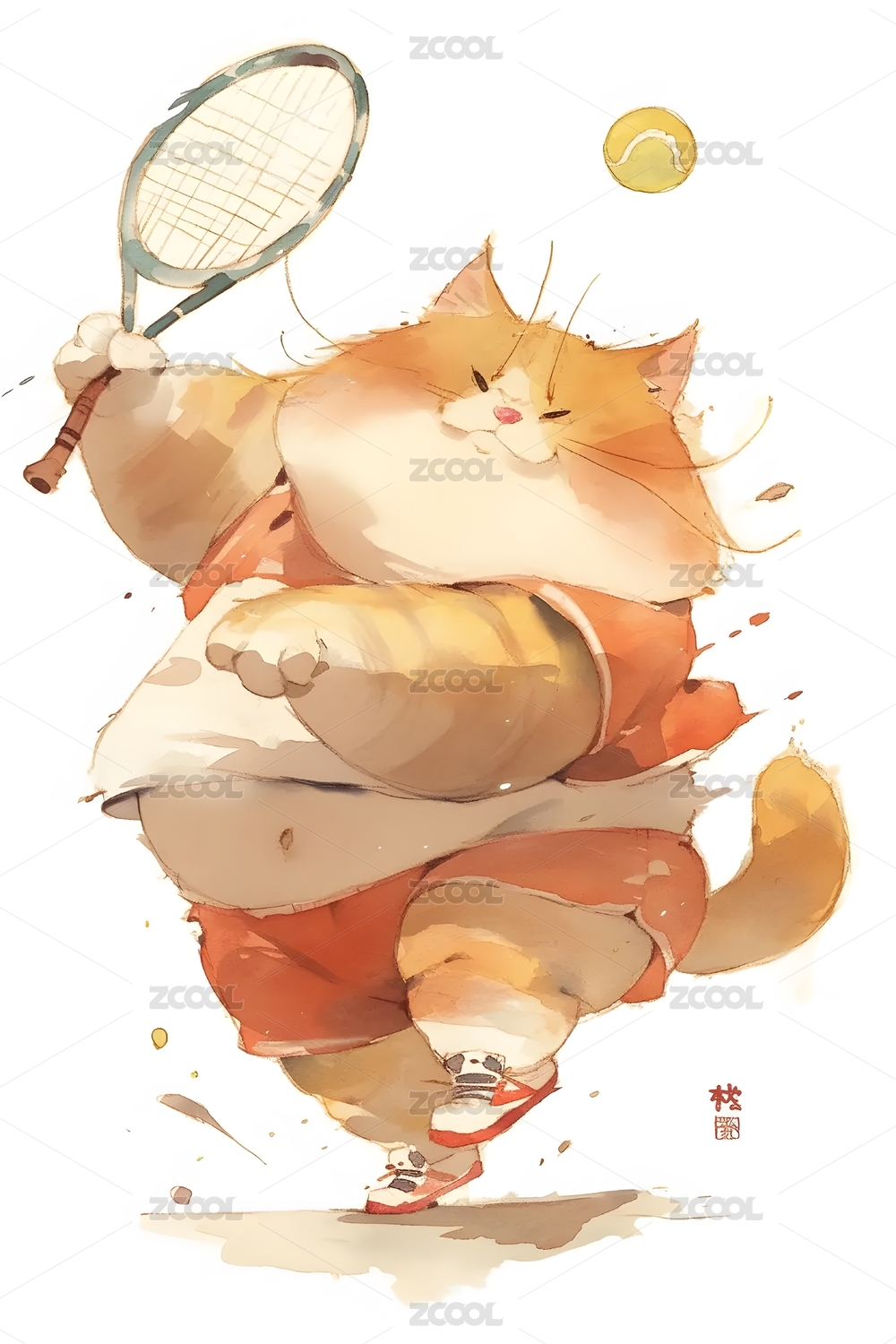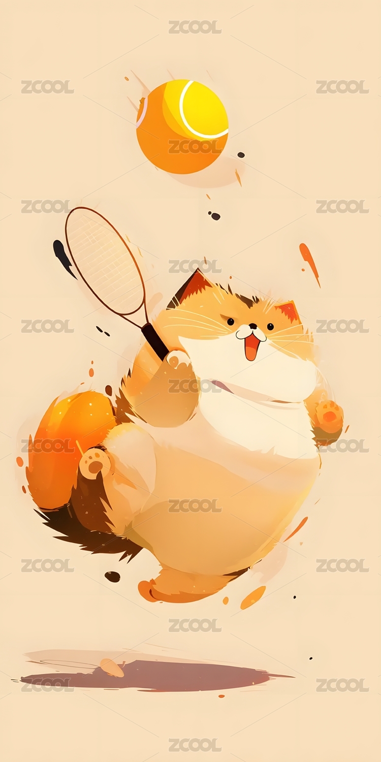 卡通,猫,插画,运动,黑,网球,球拍,胖,可爱,萌