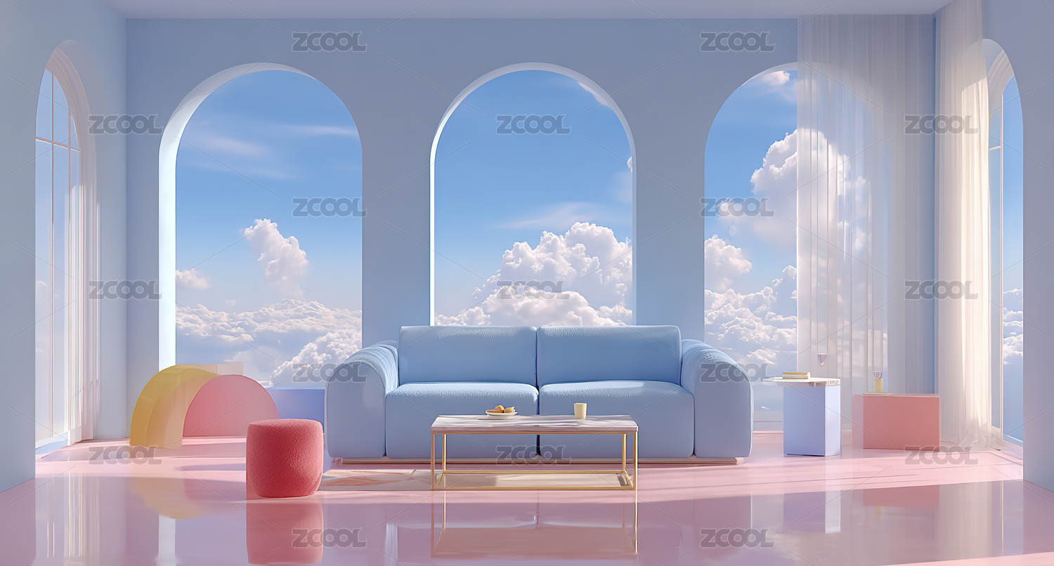 蓝天白云,背景,蓝色调,家具,浅蓝色,弧形沙发,波浪形状沙发,半圆形,沙发组合,小圆桌