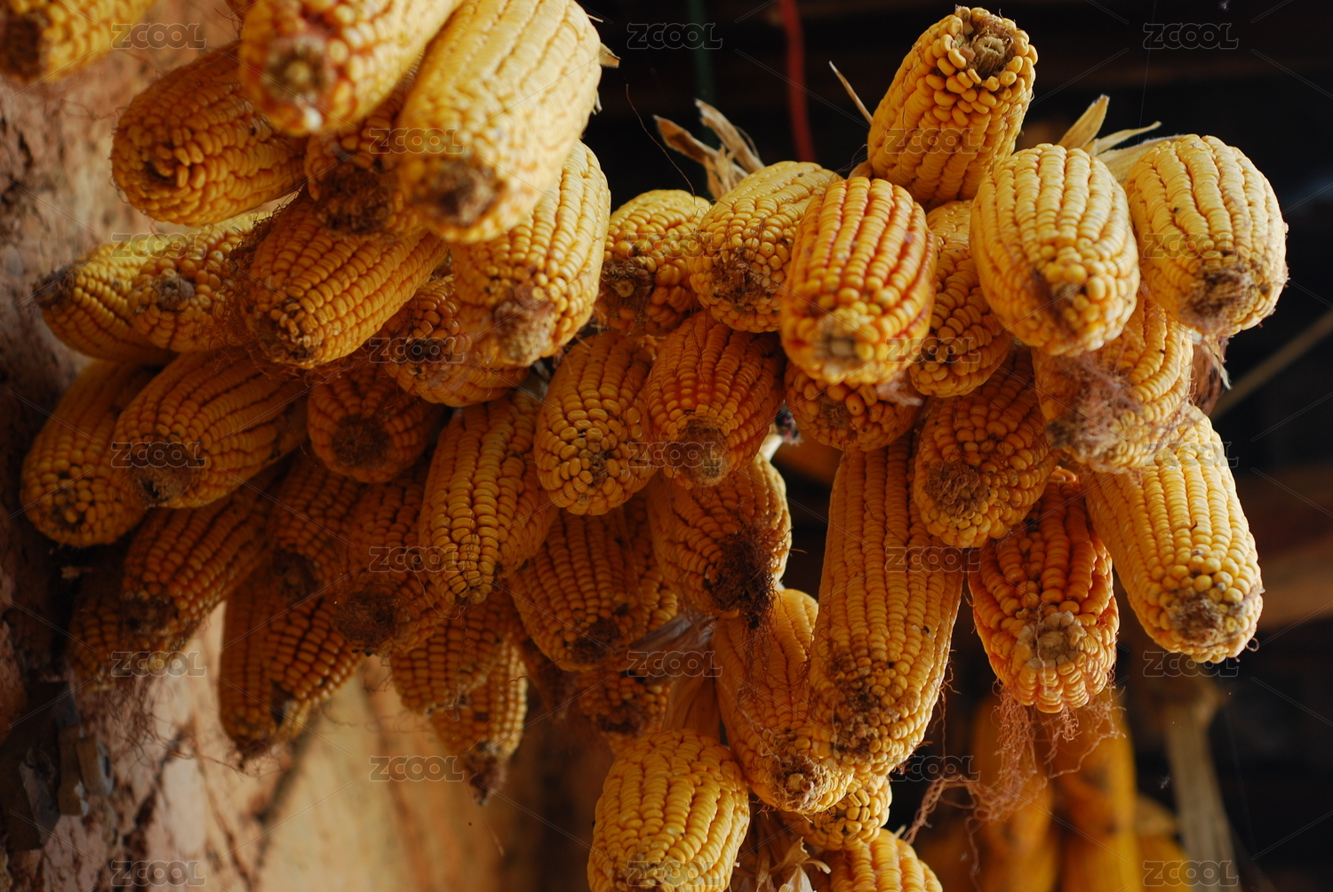 砖墙上悬挂的玉米穗