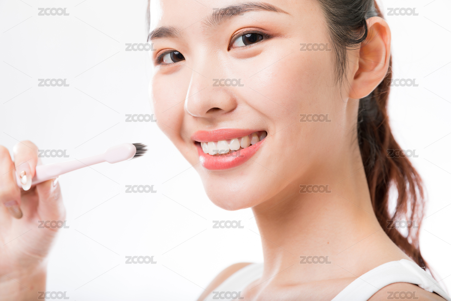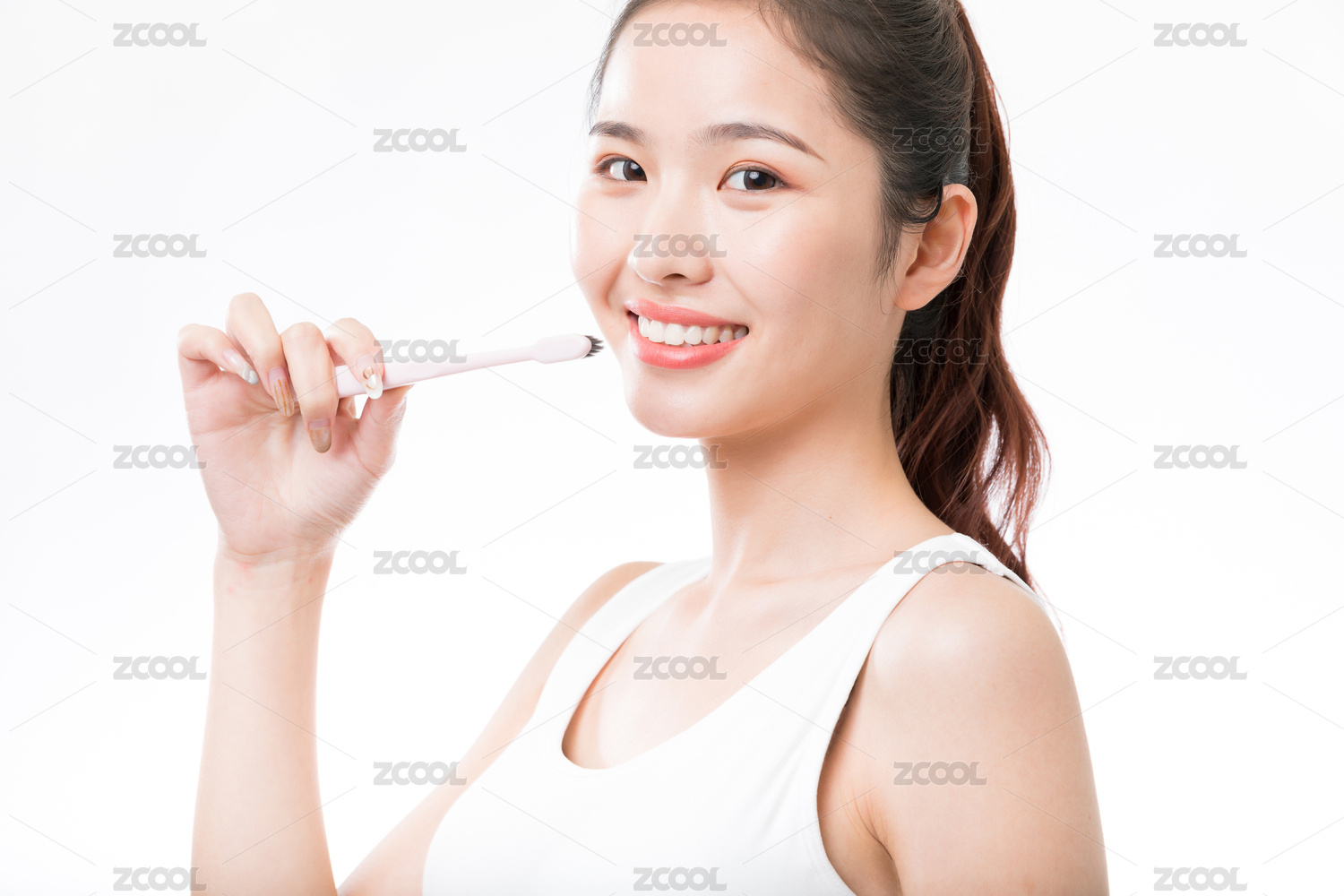 手拿牙刷的漂亮亚洲美女白色背景半身肖像