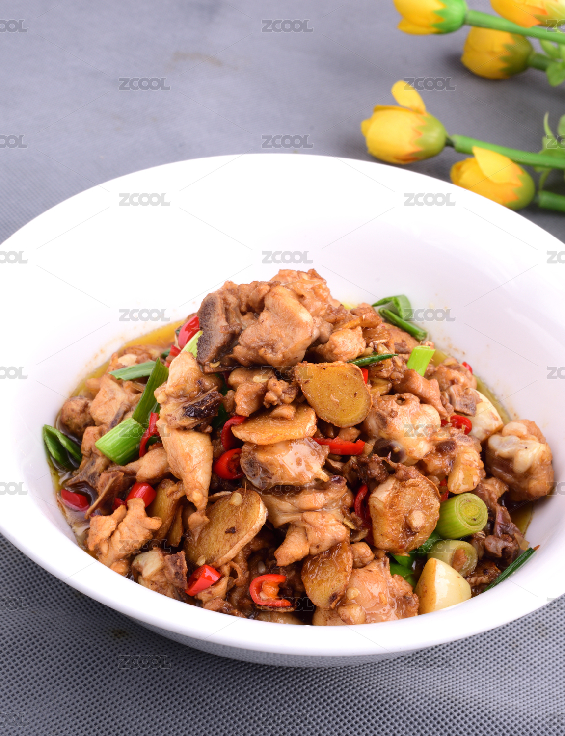 灰色背景上一个白色陶瓷锅里的姜辣砂锅鸡