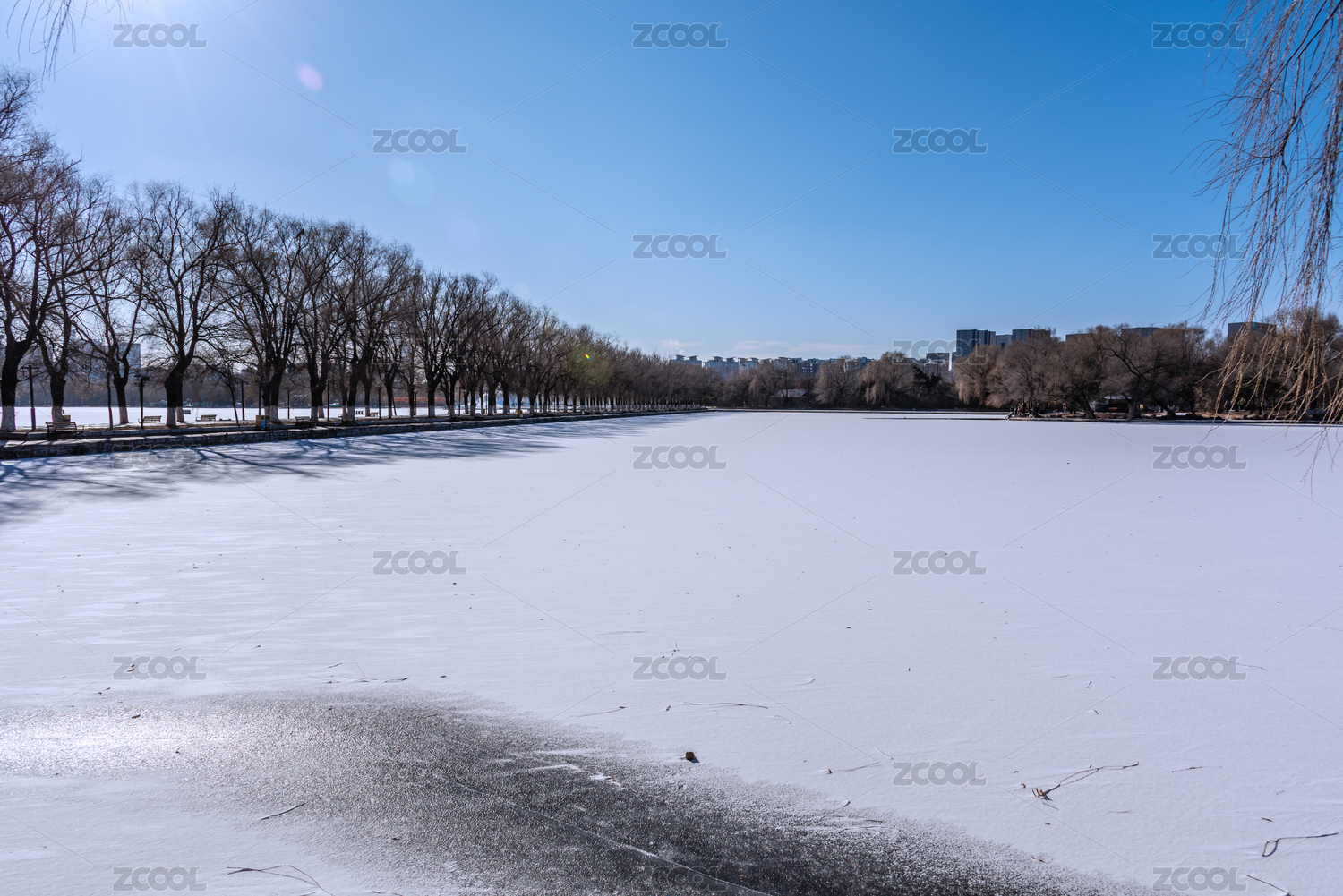 冬天中国沈阳北陵公园冰雪覆盖的湖面