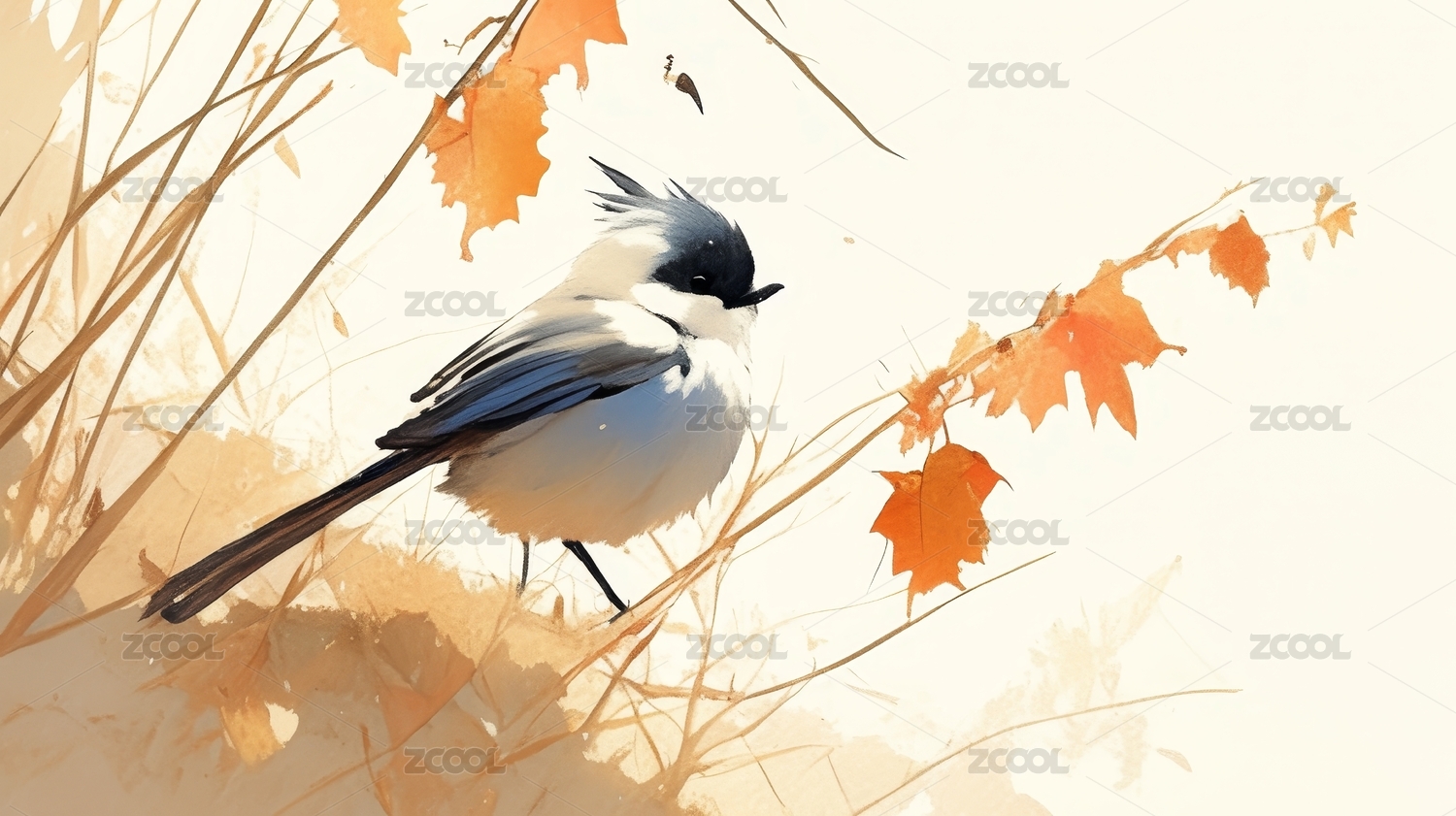 水墨风小鸟栖息树枝