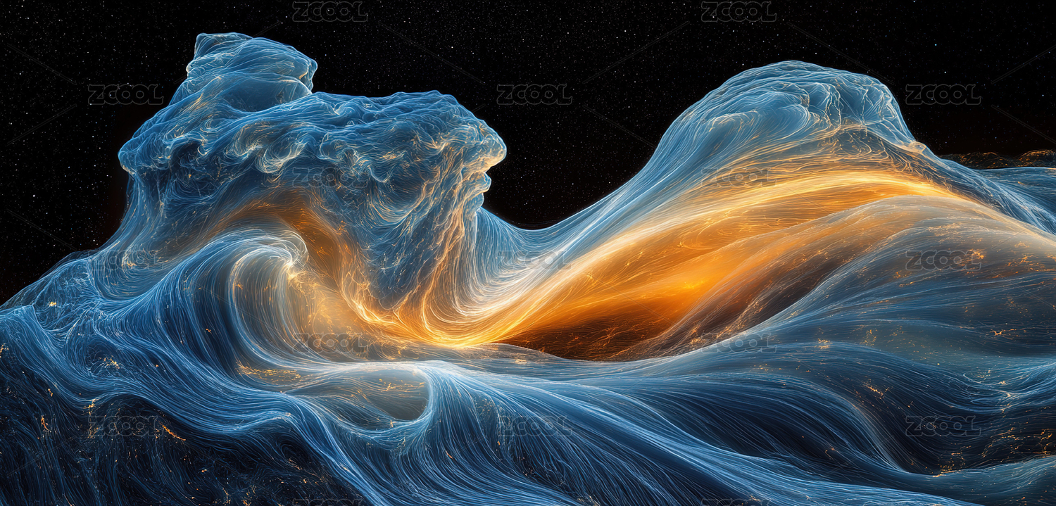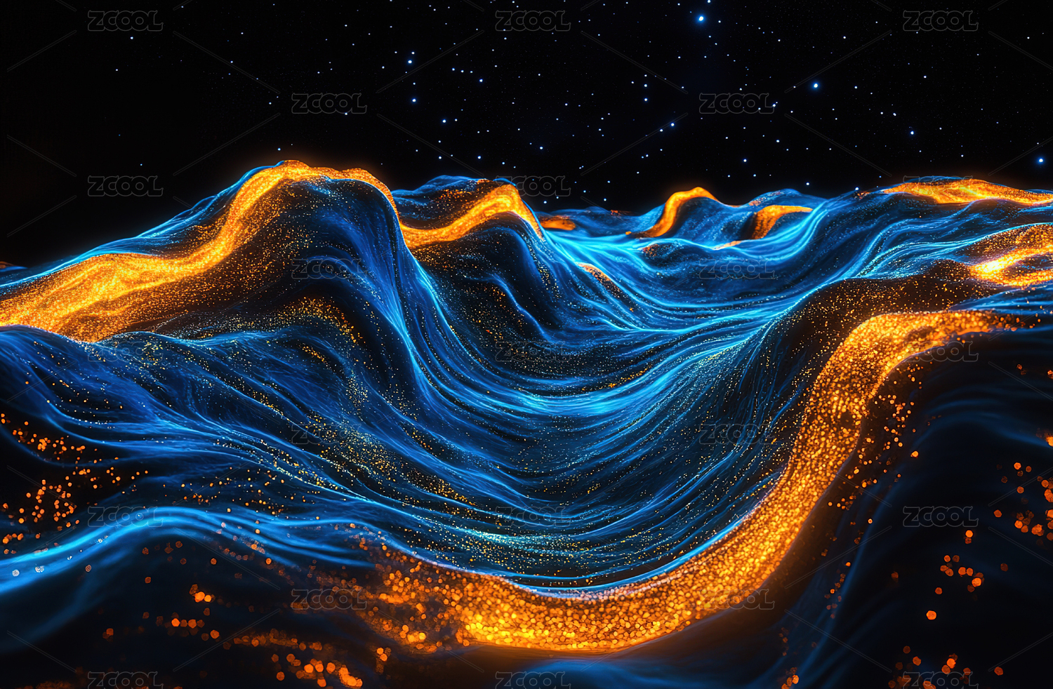 深蓝色波浪抽象海报背景,散发着橙色光点