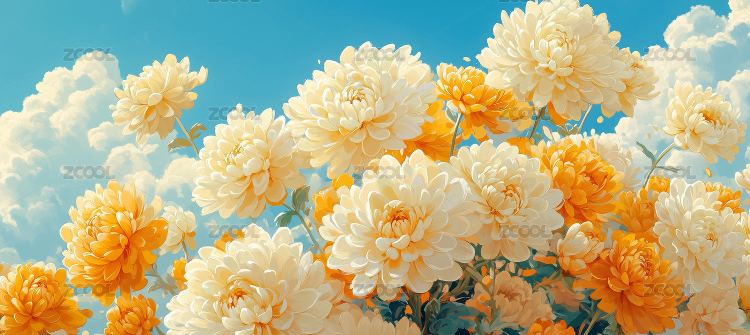 菊花,橙色,白色,天空,云朵,花朵,绘画,插画,唯美,自然