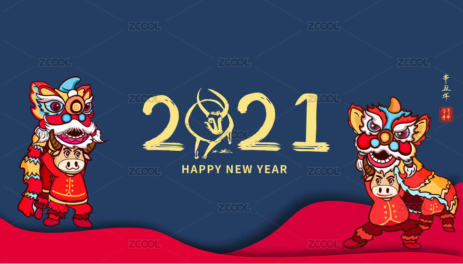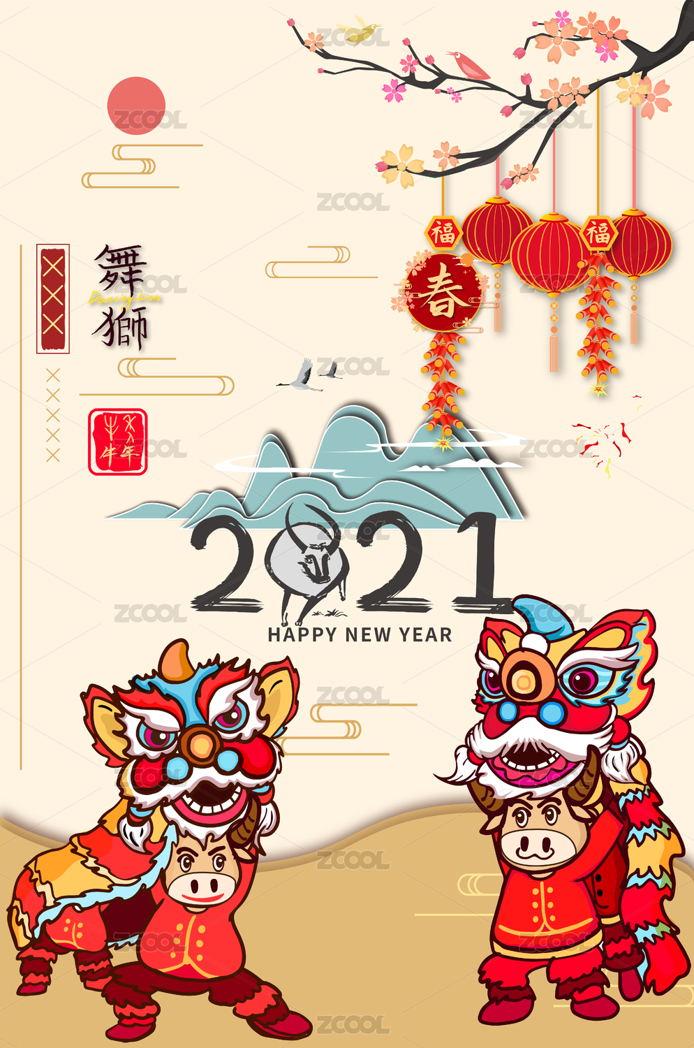 牛在舞狮来庆祝新年2021年牛年到来插画