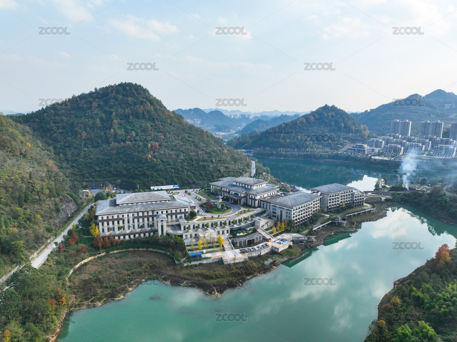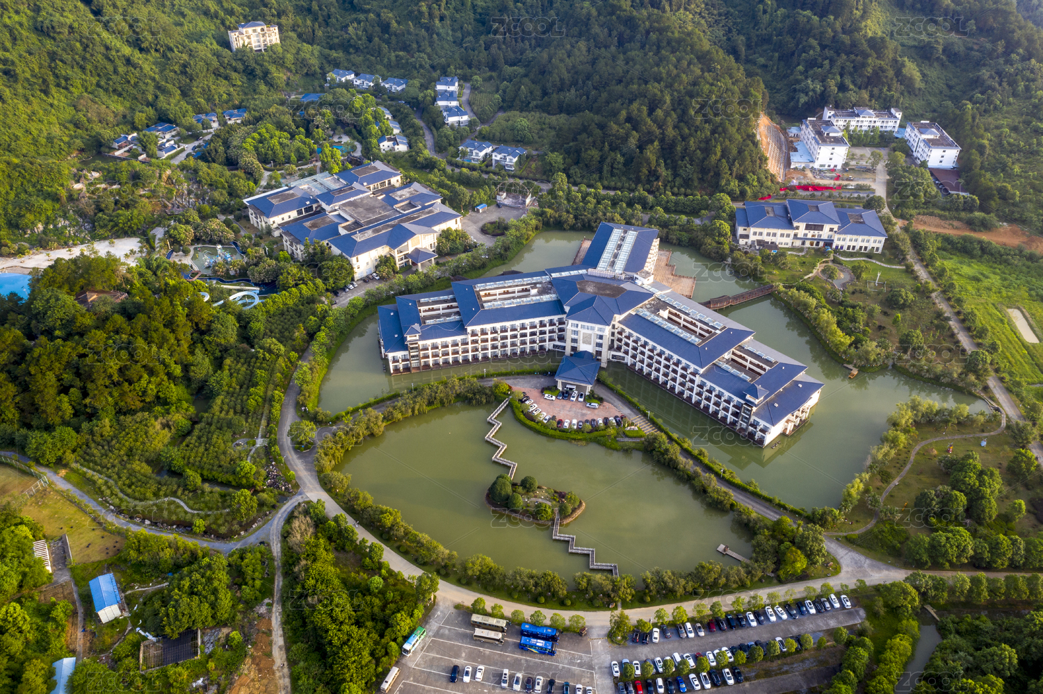 依山傍水而建的现代度假村建筑群