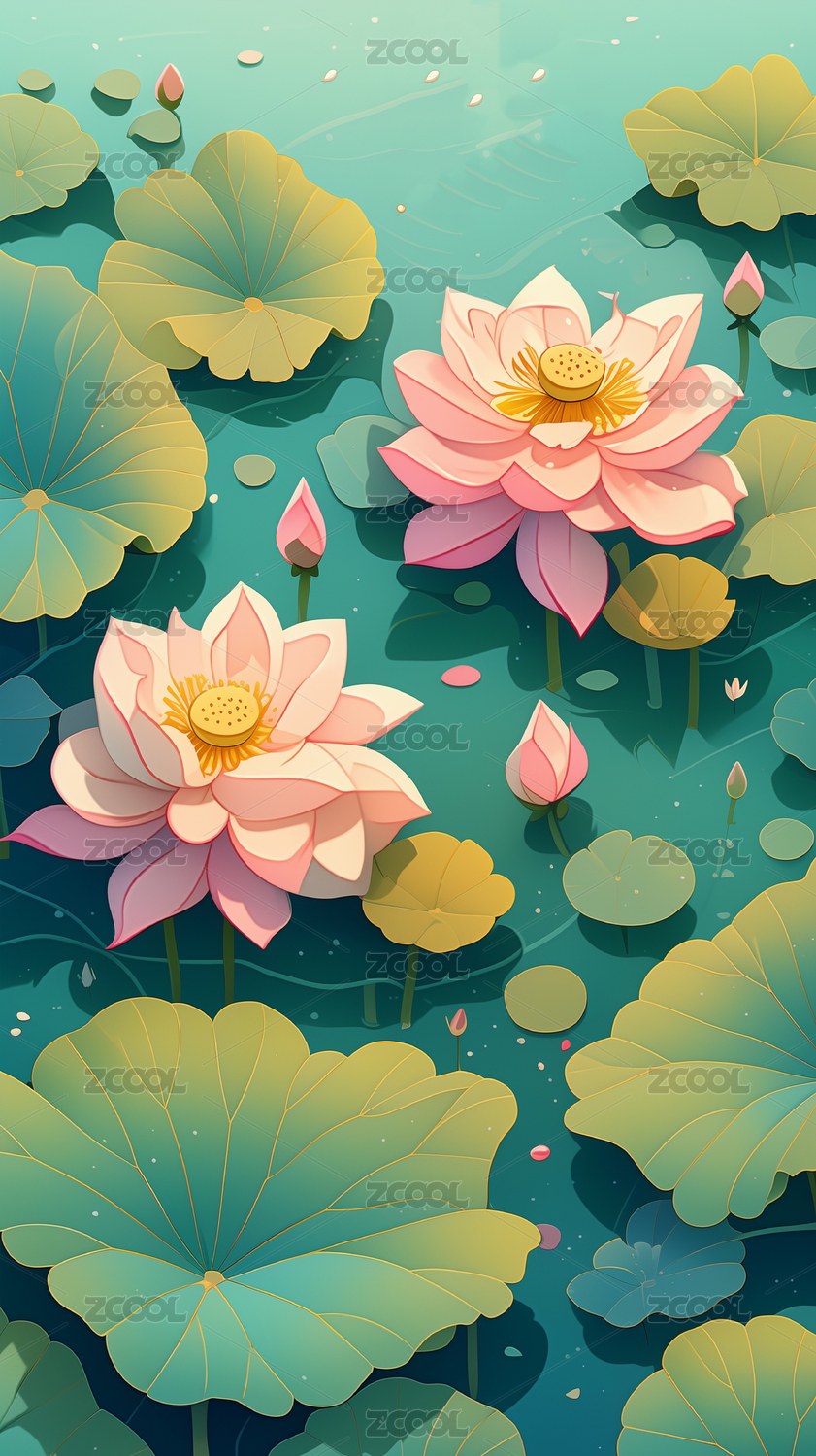 AIGCFG,中式,中国风,国潮风,插画,卡通,夏天,荷花,植物
